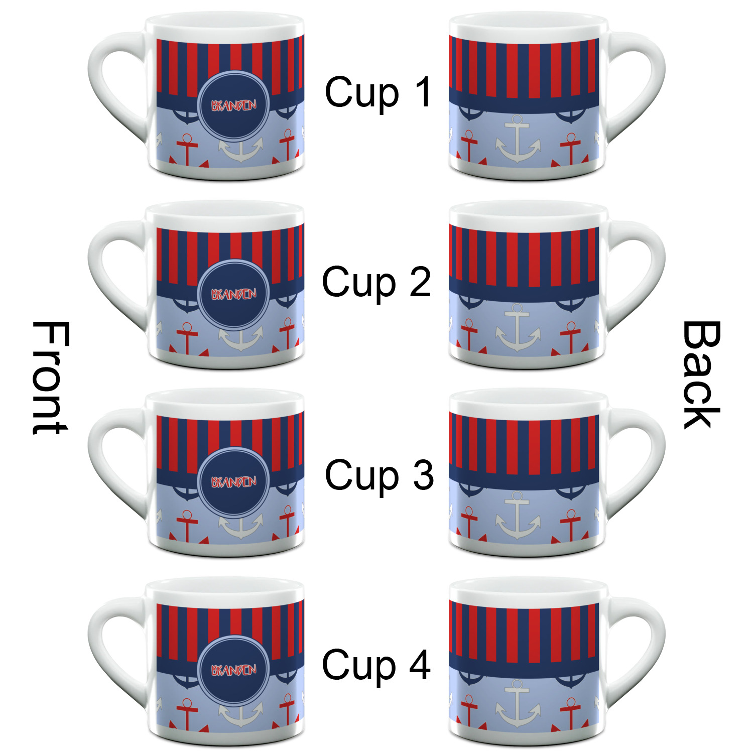 Each of our espresso mugs is a ceramic material sure to keep your drink warm. Personalize one cup for yourself, or order a set of 4! Its the perfect little gift for any coffee lover! We carry two sizes for you to personalize - 3 oz. (approx. 3.25" x 2.325" x 2.625") or 6 oz. (approx. 4" x 2.9" x 2.9"). Our 3 oz. mug is perfect for that single shot espresso while our 6 oz. mug can be your next favorite cappuccino cup holding two shots of espresso!