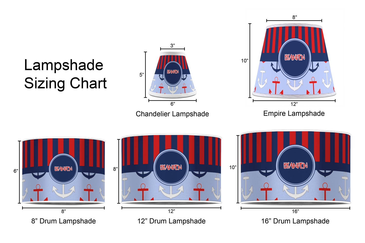 Our customized lamp shades also come in 3 different sizes: 8", 12" and 16", measuring at 8" in diameter by 6" tall, 12" in diameter by 8" tall, and 16" in diameter by 10" tall, respectively.