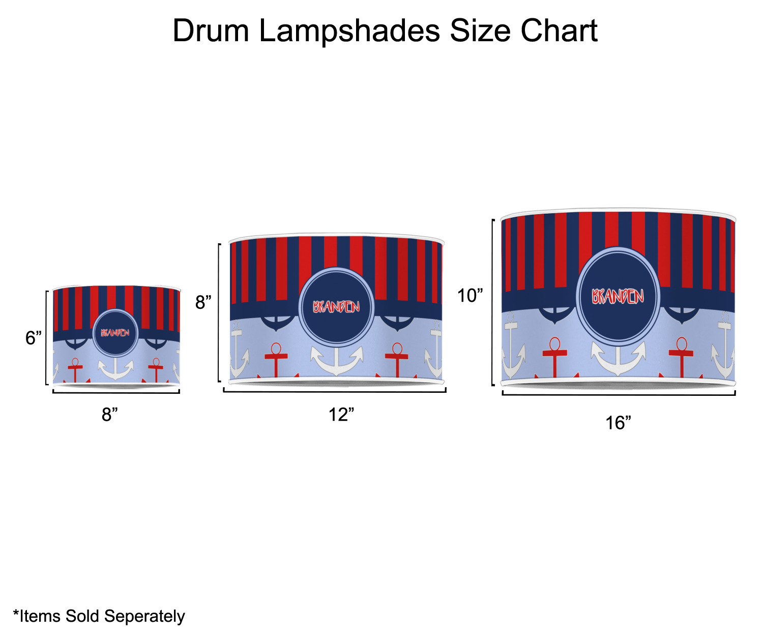 Our customized lamp shades also come in 3 different sizes: 8", 12" and 16", measuring at 8" in diameter by 6" tall, 12" in diameter by 8" tall, and 16" in diameter by 10" tall, respectively.