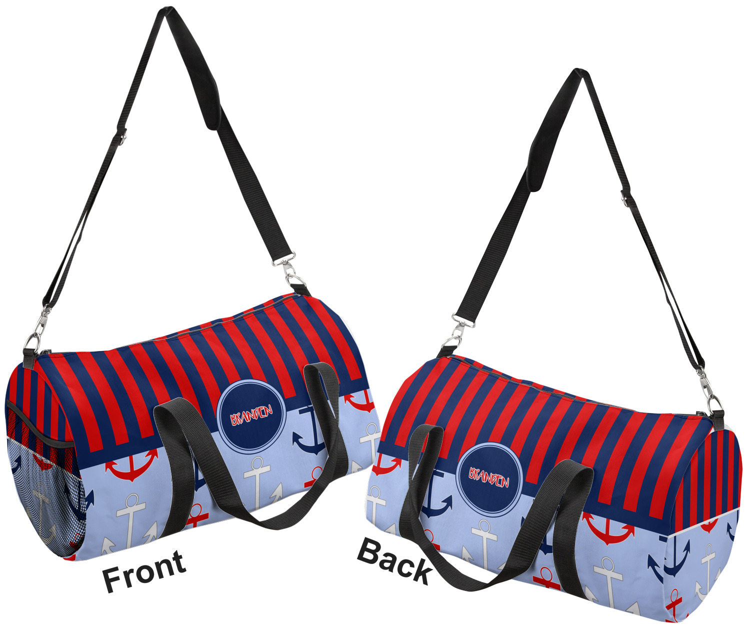 This duffle is a sturdy bag made of a canvas material. It comes in two sizes: Small (19"W x 9.5"H x 9.5"D) and Large (23"W x 12"H x 12"D). The bag is a cylindrical shape with a black adjustable strap and two handles. On one side is an elastic pouch to put a waterbottle or other small item. Your product will be sublimated with your design and is able to be designed on the front, back, and sides. Be sure to remember that the straps may cut into parts of your design if you upload your own artwork.