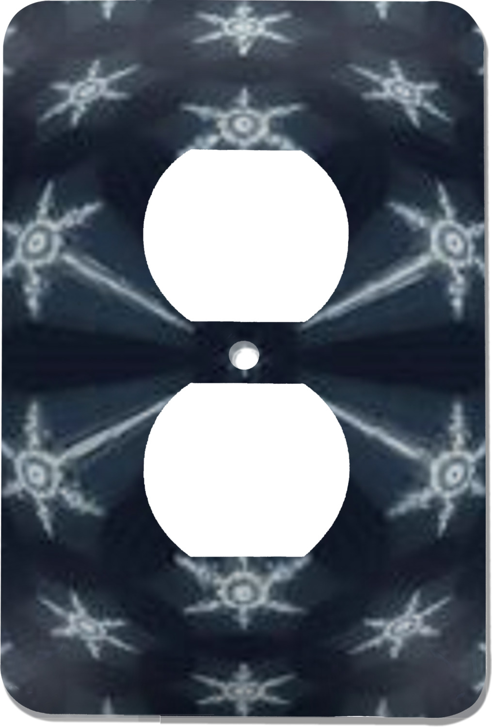 These outlet covers are made from a sturdy metal and display your design across its face. A satin finish coats the design to give it a finished look. The center of this outlet plate cover has a small hole to accommodate a screw upon installation. With your purchase of this decorative outlet cover, we include one screw. This outlet plate is of a standard size, and measures at approximately 3.5 by 5 inches.