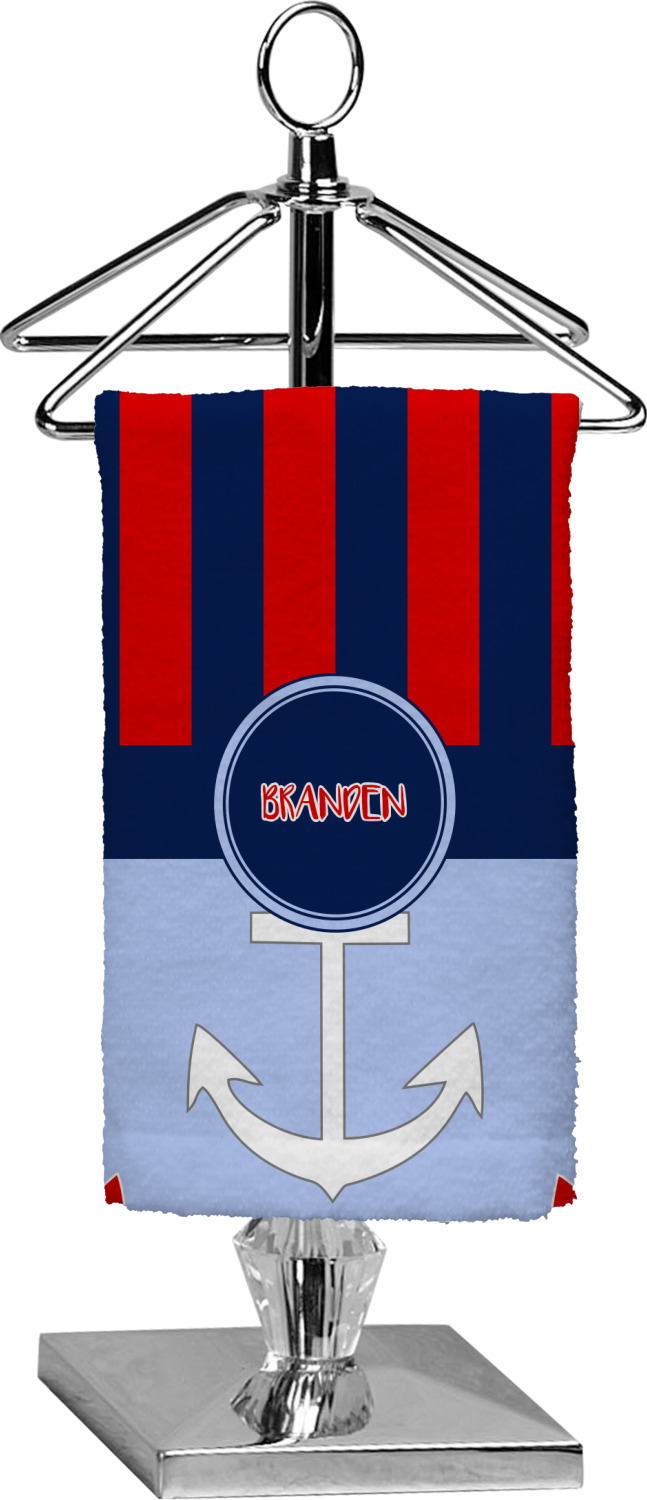 This anchor & stripes pattern is a classic nautical including the colors. We chose the classic nautical red and navy blue striped on top, with anchors in red, white and blue on the bottom. We chose a solid navy ribbon along with a circle label and personalized it with a name.