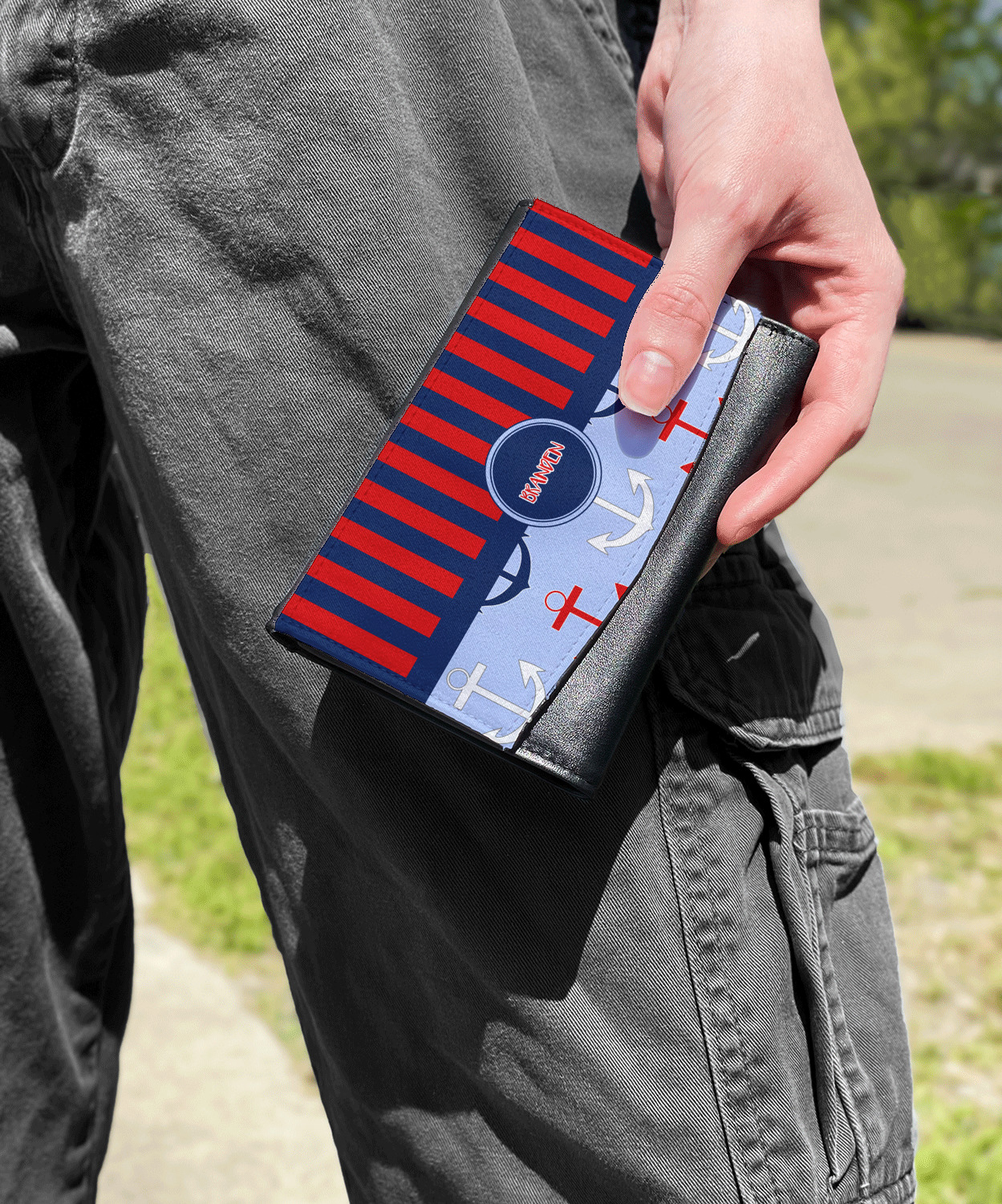 The compact size of this wallet - 5.5in wide, 3.5in tall and 0.75in thick when folded - makes it perfect to hold in hand and small enough to fit in a clutch or a normal size purse. The outside flap is customized with your choice of artwork and closes with a snap closure - with two different snaps to allow it to be adjusted when storing more items - to securely fasten the flap.