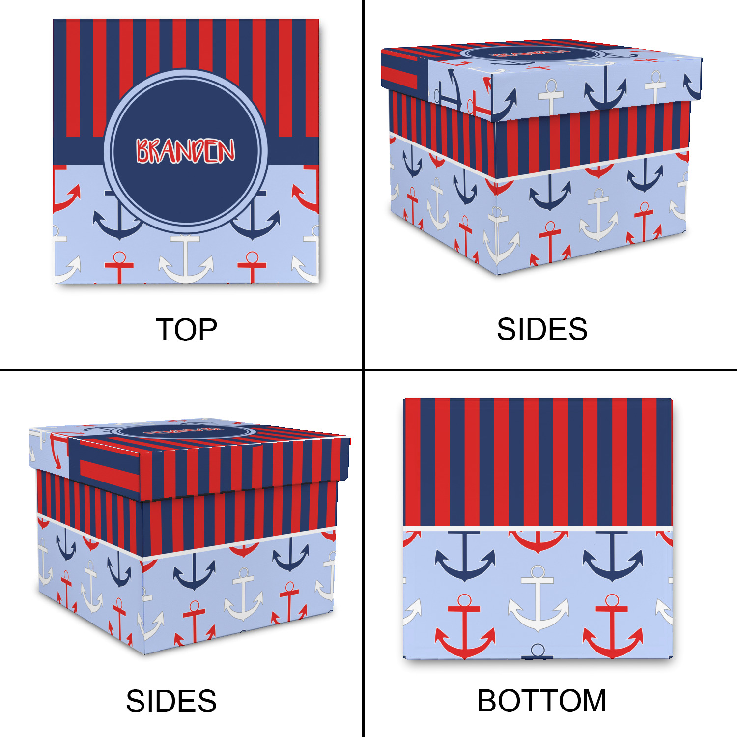 This anchor & stripes pattern is a classic nautical including the colors. We chose the classic nautical red and navy blue striped on top, with anchors in red, white and blue on the bottom. We chose a solid navy ribbon along with a circle label and personalized it with a name.