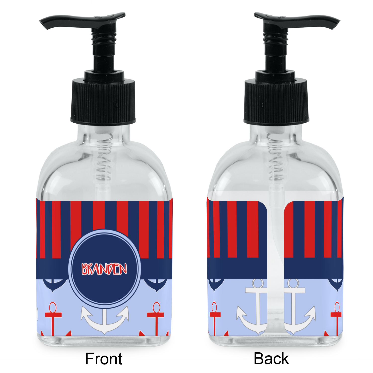Crafted from a high-quality glass, these soap dispensers and lotion dispensers are durable and robust, while still looking elegant. They are sold with black pumps. Each soap dispenser pump measures at 6.5 by 2.25 inches. On these soap pumps, we display your customized design on a personalized vinyl adhesive on three sides. That way, you can judge how much liquid is in the bottles from the back.