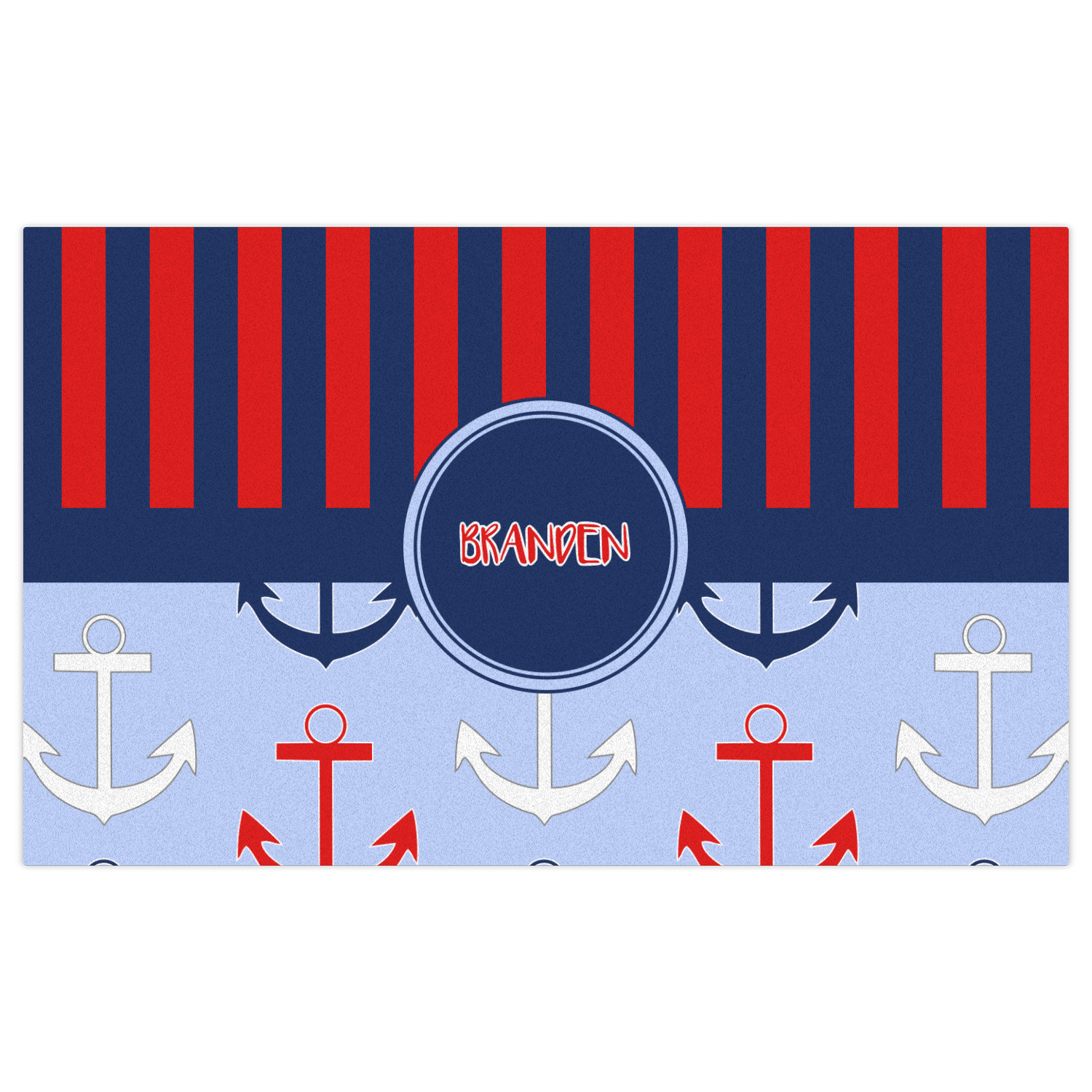 This anchor & stripes pattern is a classic nautical including the colors. We chose the classic nautical red and navy blue striped on top, with anchors in red, white and blue on the bottom. We chose a solid navy ribbon along with a circle label and personalized it with a name.