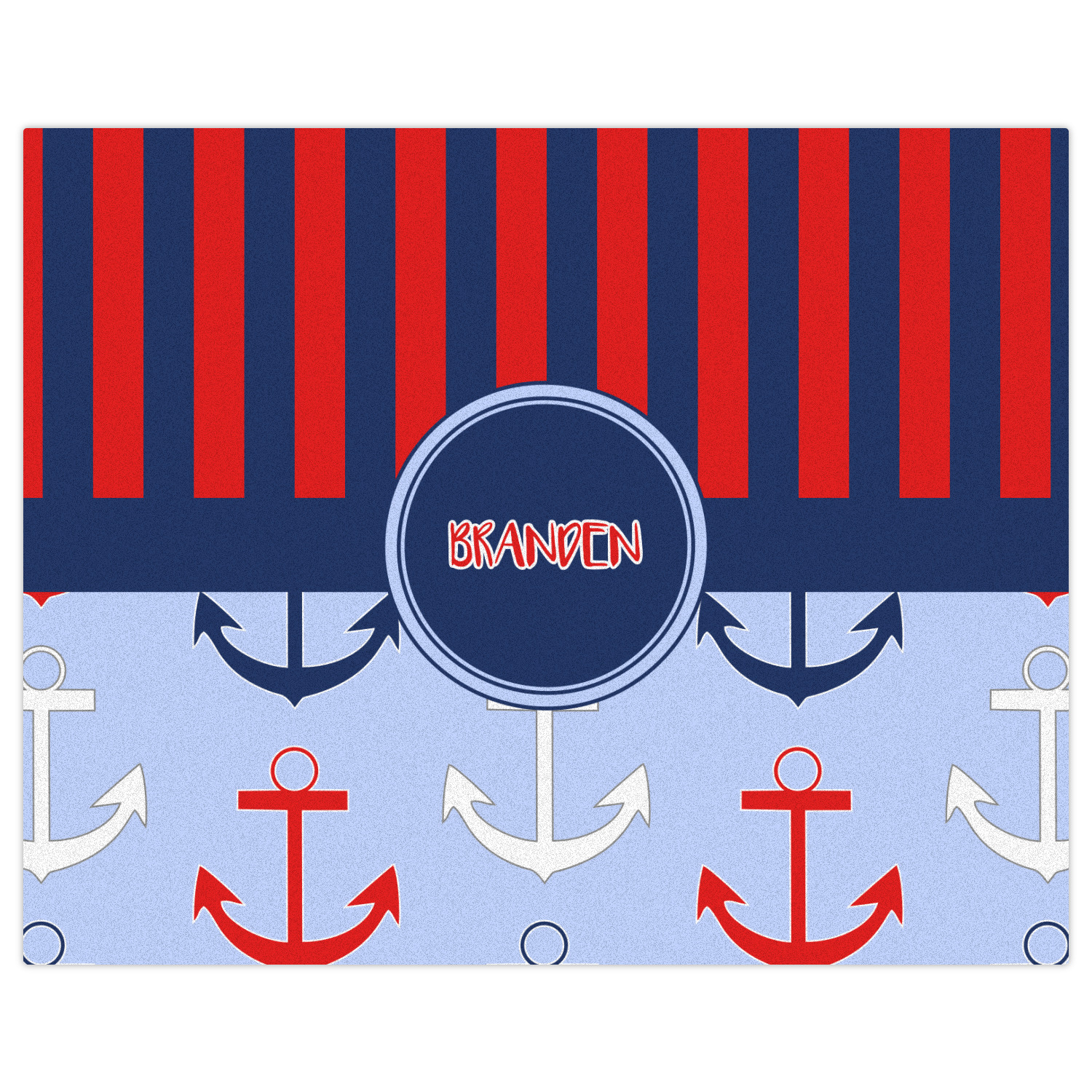 This anchor & stripes pattern is a classic nautical including the colors. We chose the classic nautical red and navy blue striped on top, with anchors in red, white and blue on the bottom. We chose a solid navy ribbon along with a circle label and personalized it with a name.