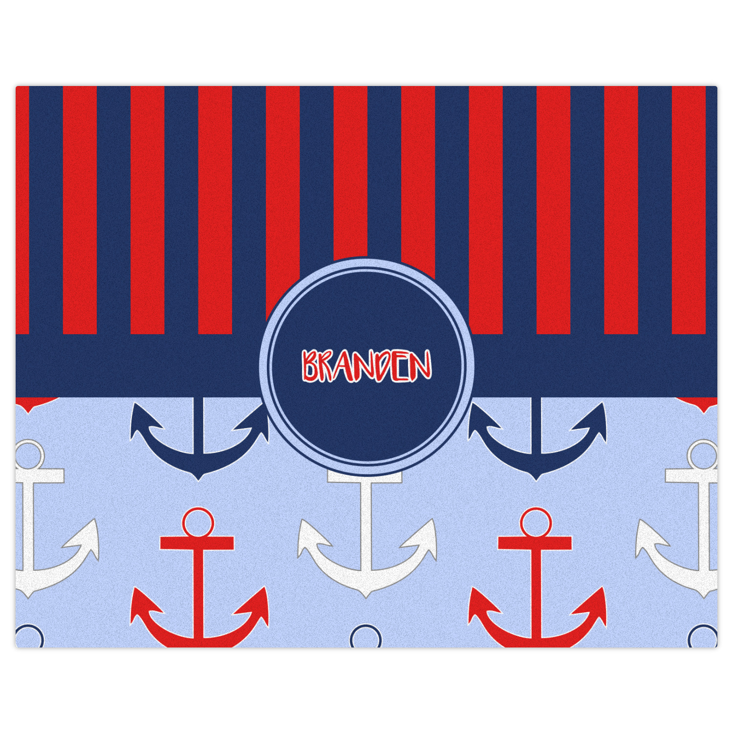 This anchor & stripes pattern is a classic nautical including the colors. We chose the classic nautical red and navy blue striped on top, with anchors in red, white and blue on the bottom. We chose a solid navy ribbon along with a circle label and personalized it with a name.