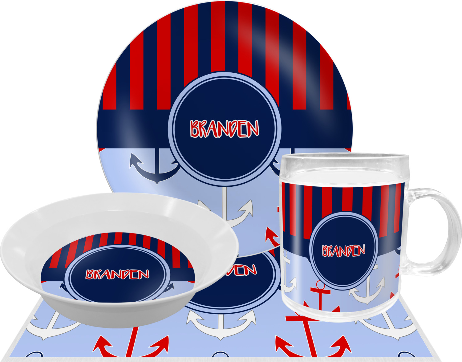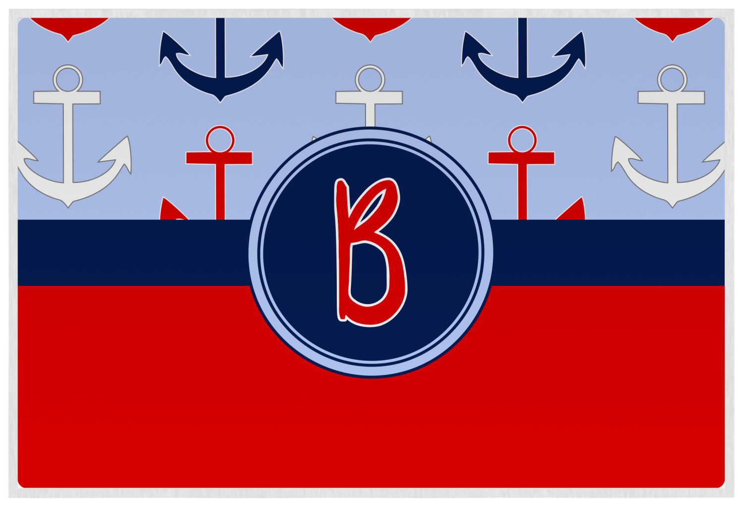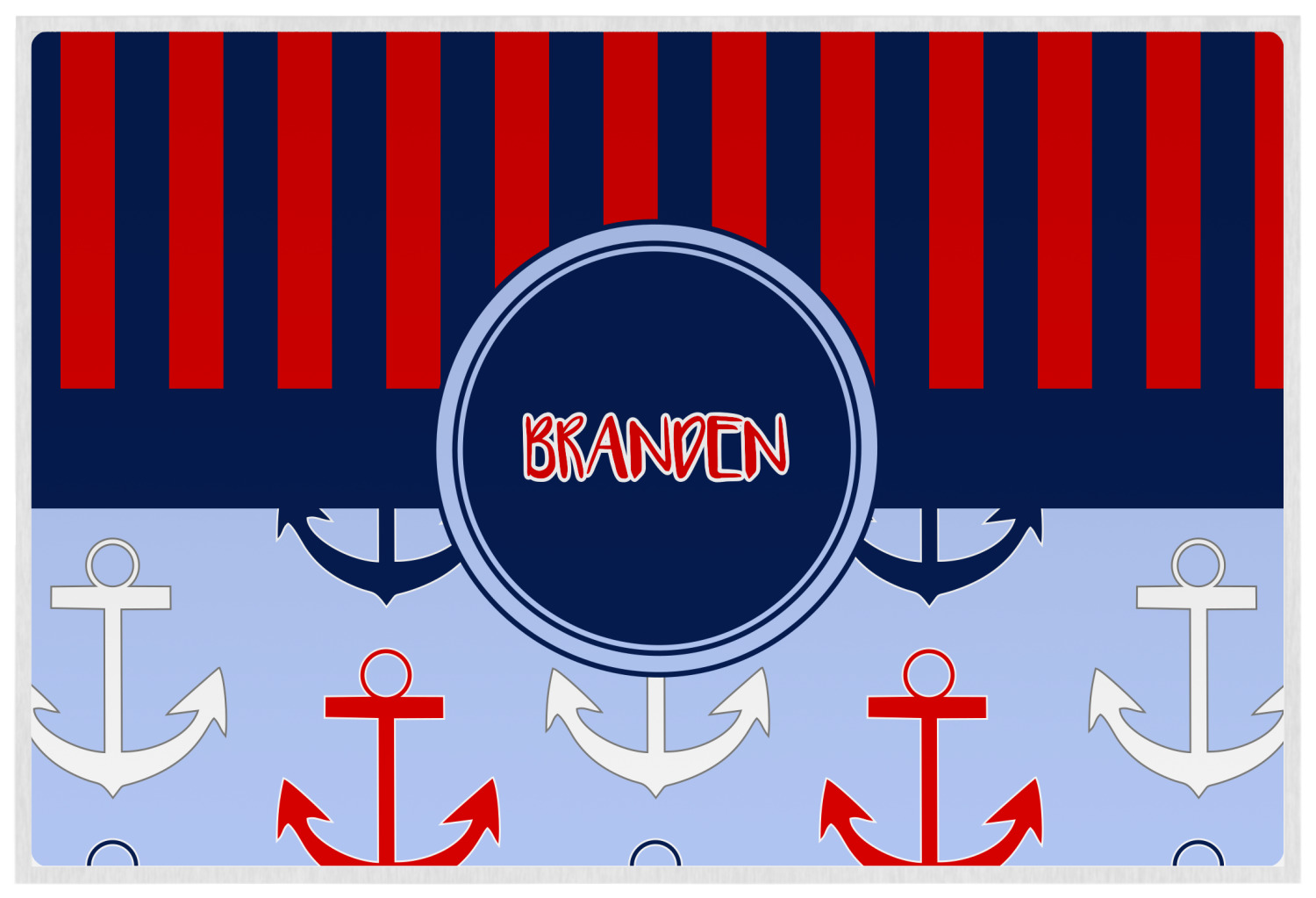 This anchor & stripes pattern is a classic nautical including the colors. We chose the classic nautical red and navy blue striped on top, with anchors in red, white and blue on the bottom. We chose a solid navy ribbon along with a circle label and personalized it with a name.