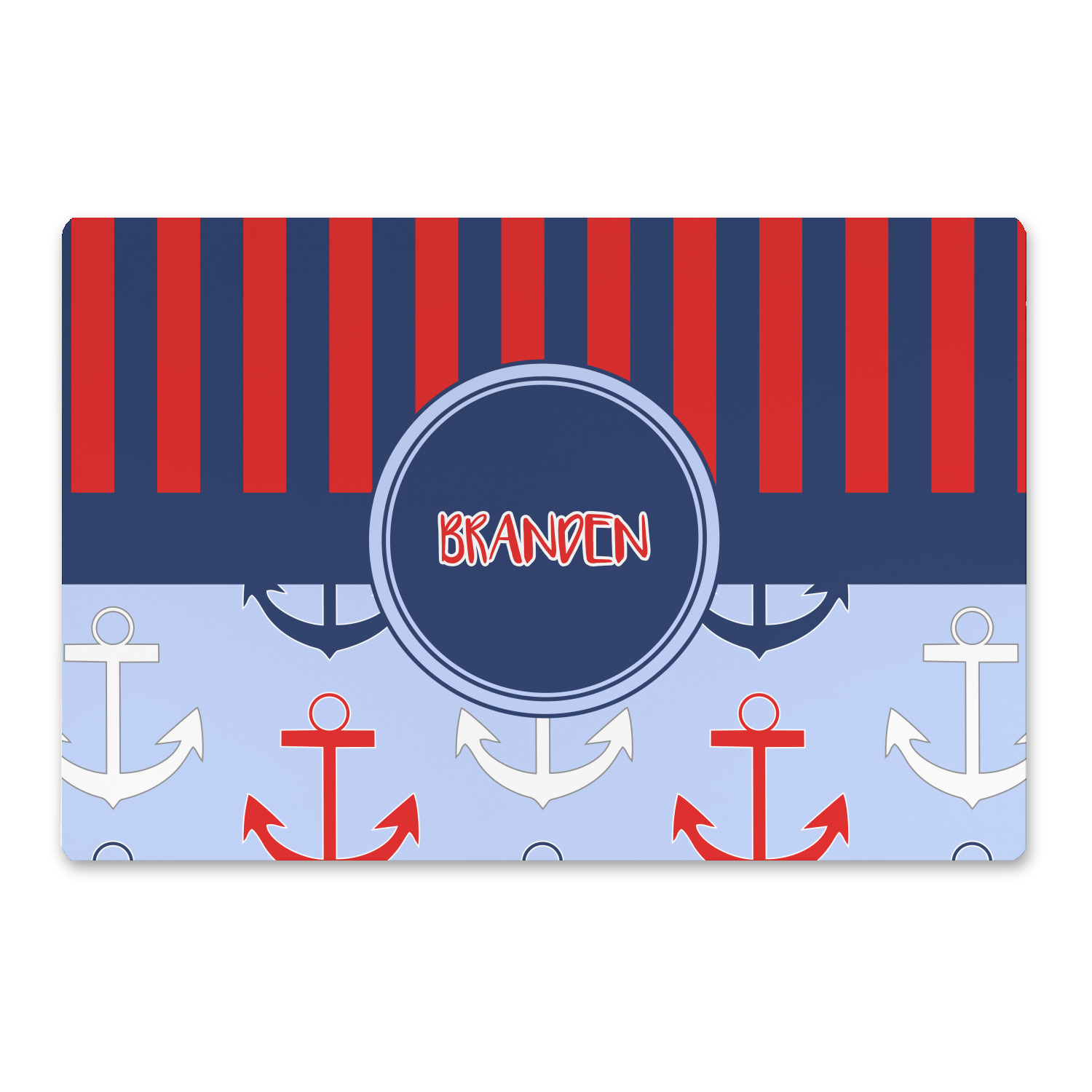 This anchor & stripes pattern is a classic nautical including the colors. We chose the classic nautical red and navy blue striped on top, with anchors in red, white and blue on the bottom. We chose a solid navy ribbon along with a circle label and personalized it with a name.