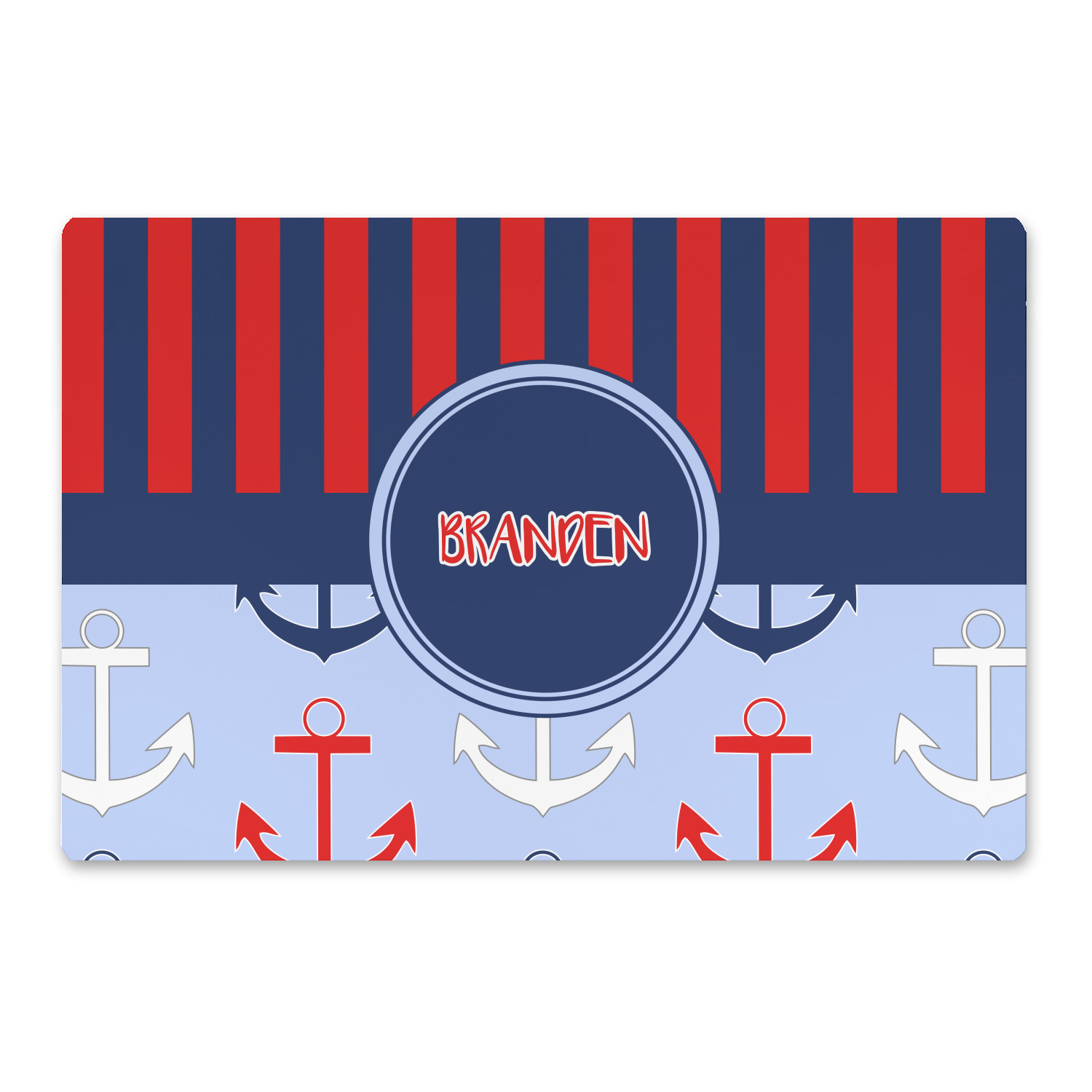 This anchor & stripes pattern is a classic nautical including the colors. We chose the classic nautical red and navy blue striped on top, with anchors in red, white and blue on the bottom. We chose a solid navy ribbon along with a circle label and personalized it with a name.