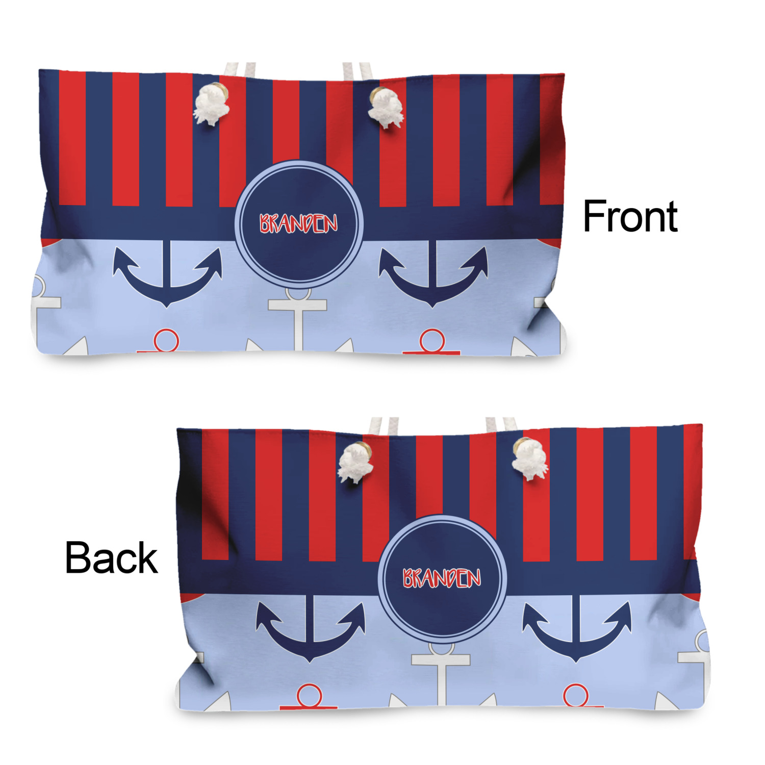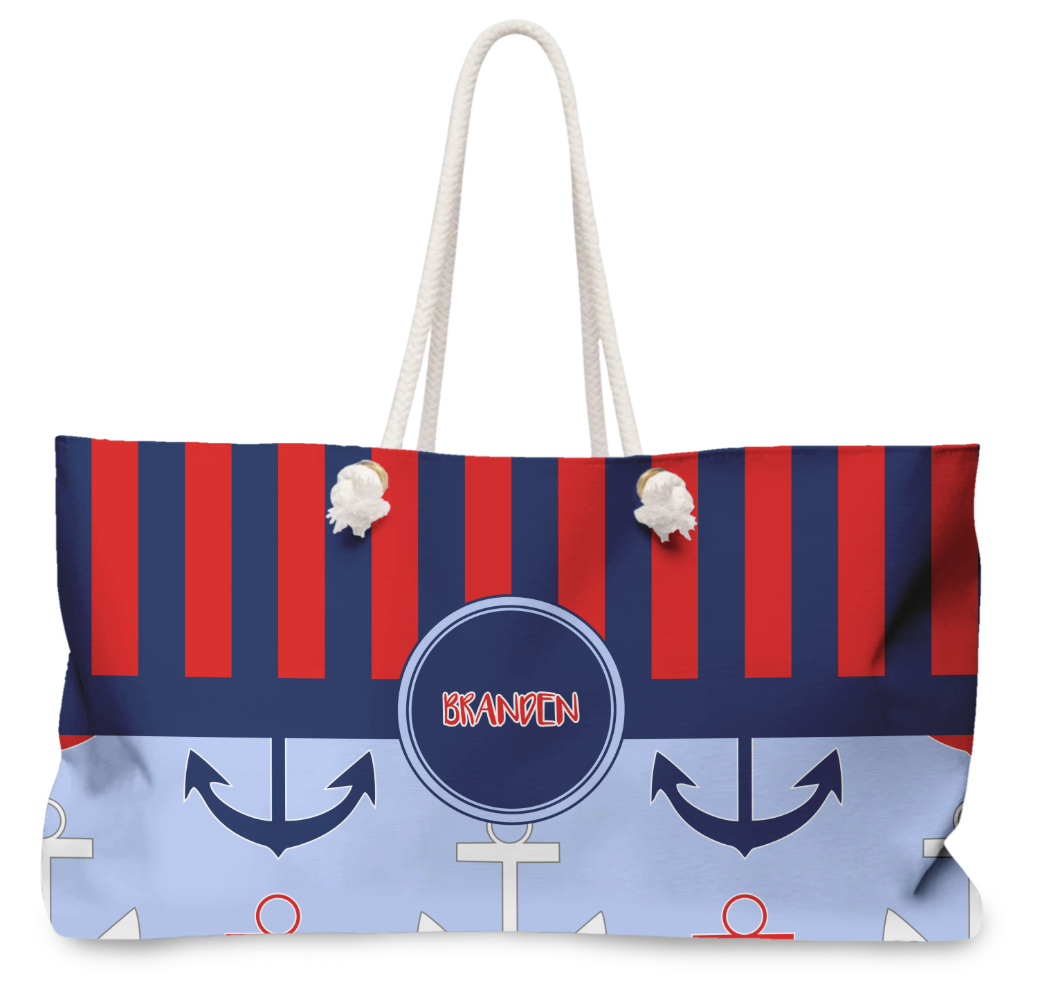 Our oversized weekender tote with rope handles is perfect for your weekend at the beach or on the town. This large tote are 24" W X 13" H, with a 5" gusset and a 27" thick rope handles with a knot that is put through a grommeted brass hole.