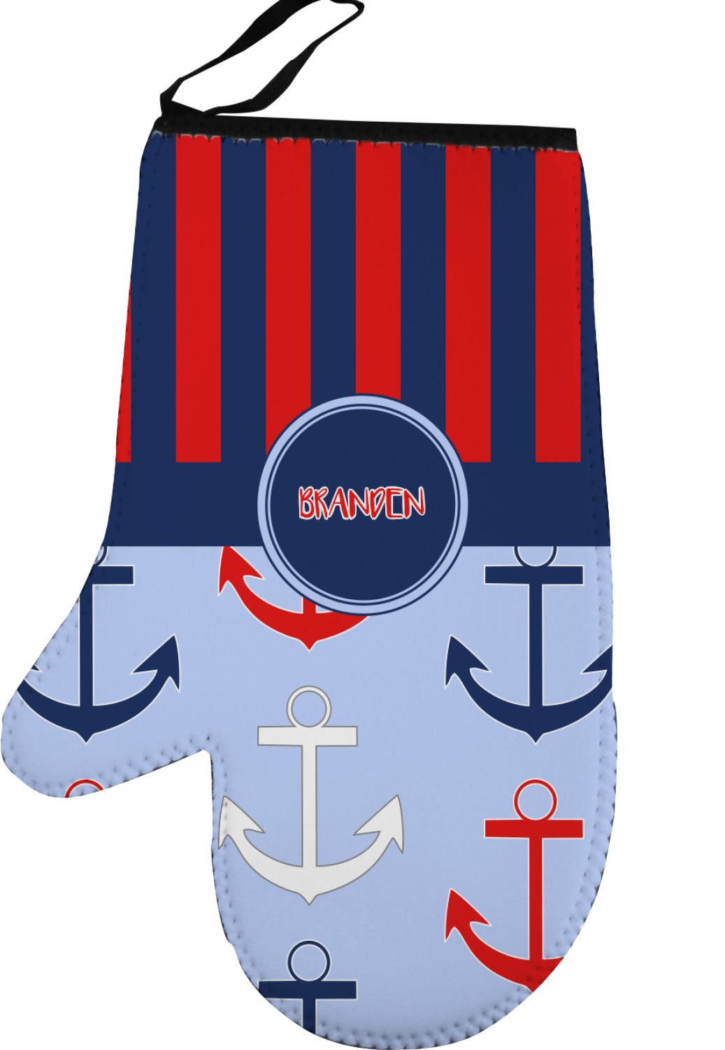 Our oven gloves are made from a durable neoprene and feature a textured, rubberized surface on the palms side for a better grip. A strong stitch joins the neoprene and rubber, increasing the durability of this mitt. These kitchen mittens are spacious and can accommodate both small and large hands. A thin, black loop is attached to the mitts top, which can be used to display and store the mitt. Your customization is displayed across the entire front of the neoprene surface, or the top of the glove. We sell both left and right models of these, separately.