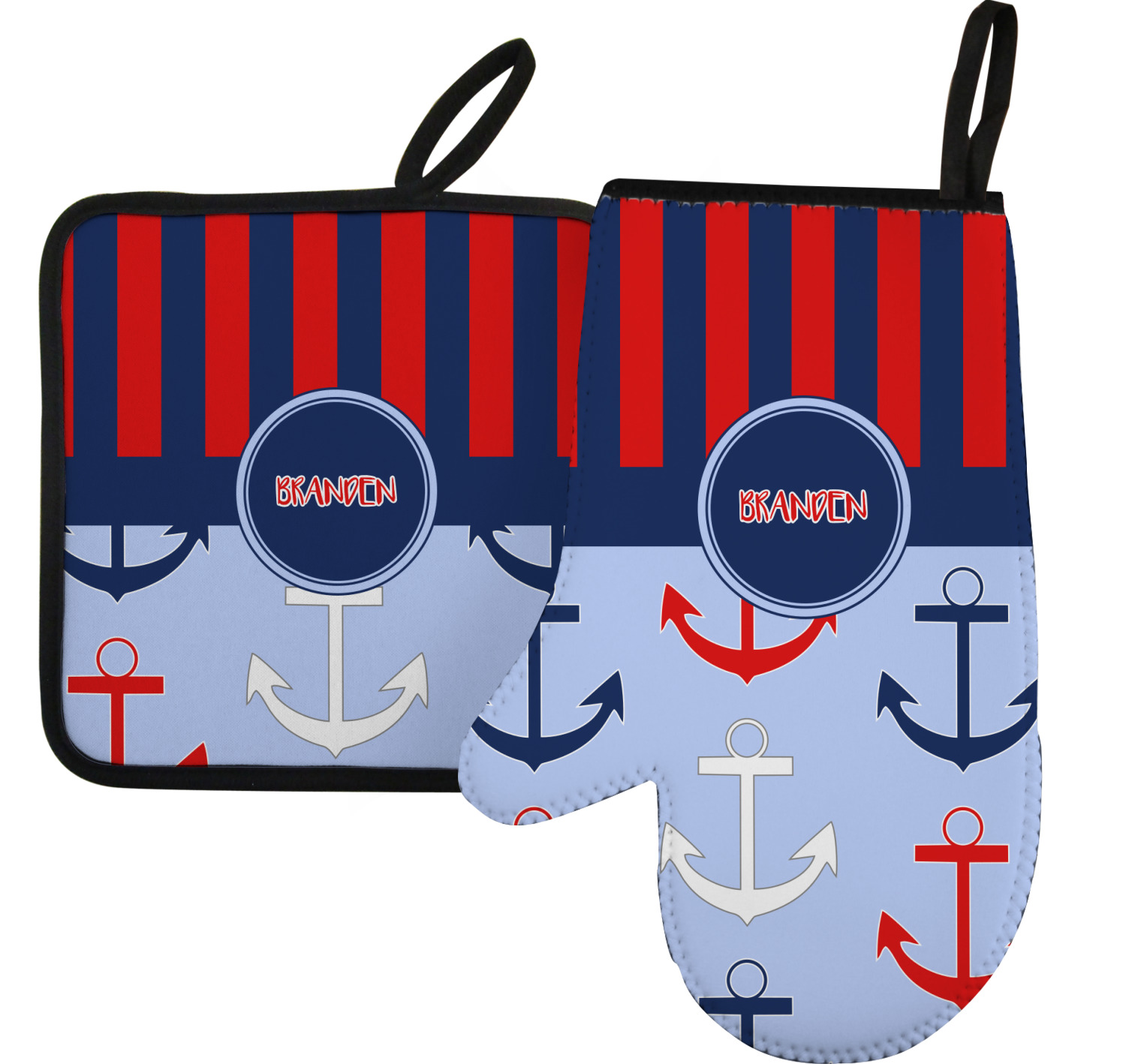 Along with our heat resistant gloves, we also carry personalized pot holders. These pot holders also feature a neoprene front that displays your personalization, and a textured, rubber backing for a sturdy grip. The two materials are connected with a sleek, black trim, and the hot pot holder also includes an attached loop for hanging and storage. You can purchase a kitchen pot holder by itself, or alongside a right or left oven mitt, depending on your needs. The pot holder itself is approximately 8.75 inches by 8.75 inches and 0.25 inches tall.