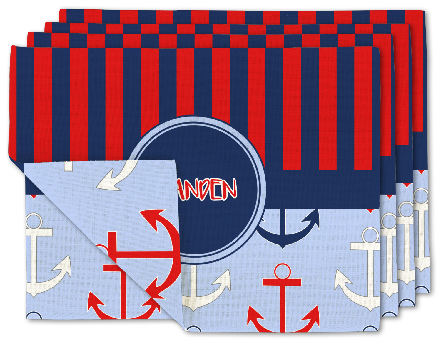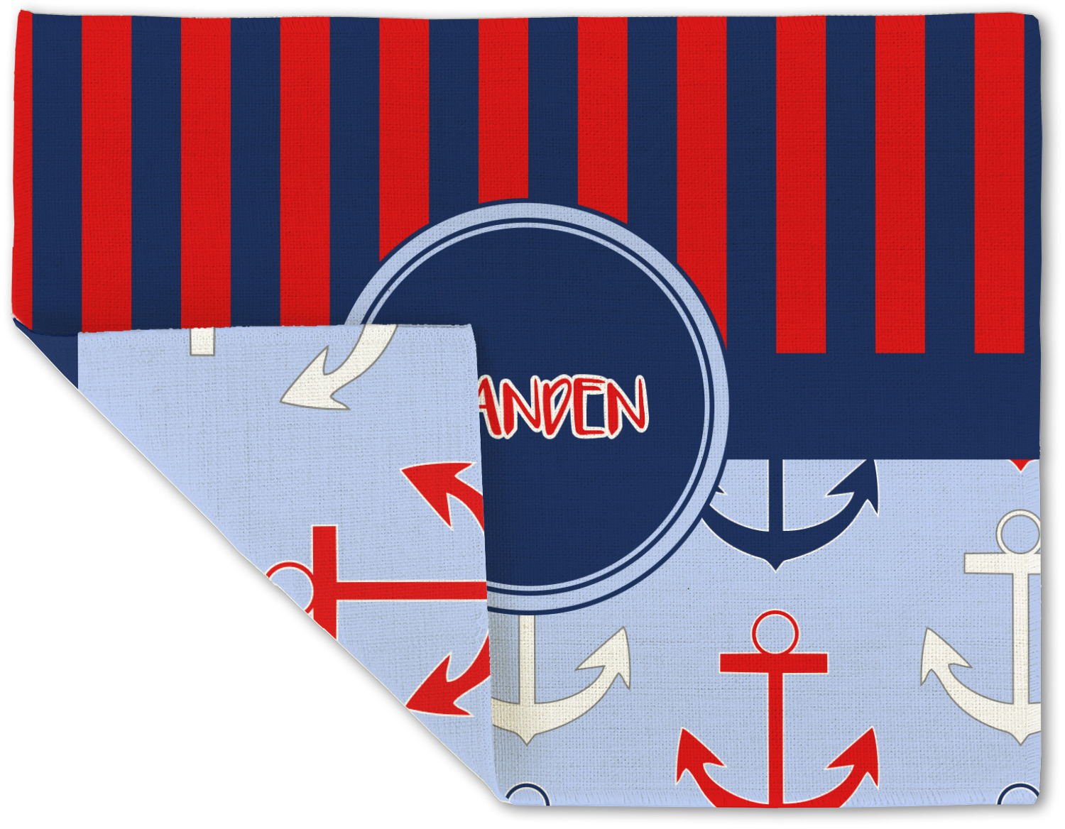 This anchor & stripes pattern is a classic nautical including the colors. We chose the classic nautical red and navy blue striped on top, with anchors in red, white and blue on the bottom. We chose a solid navy ribbon along with a circle label and personalized it with a name.
