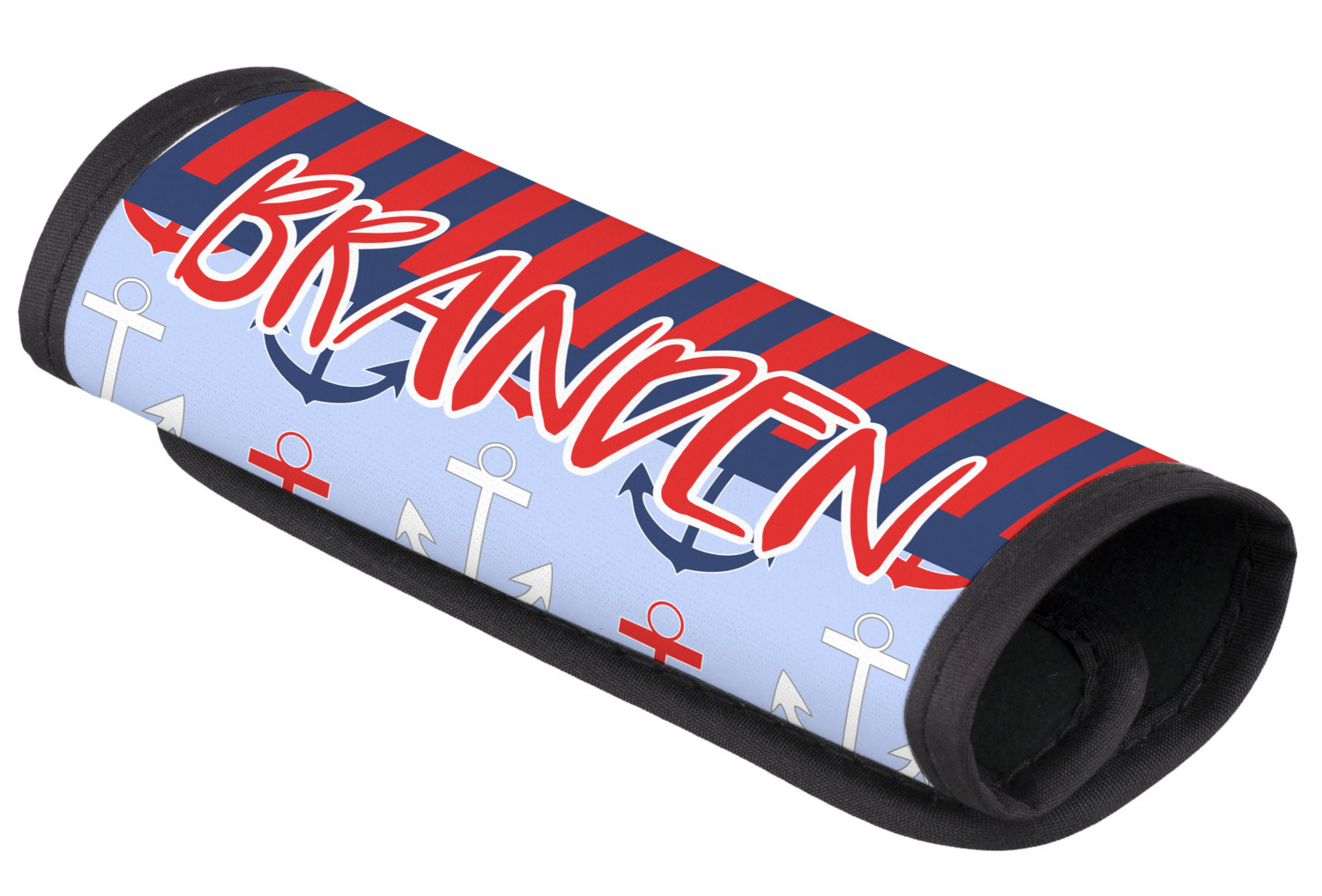 The luggage handle covers are made of neoprene with black trim and have Velcro closure to snugly fit around the handle. Your design is printed on the neoprene. The covers measure approx 5"x6".