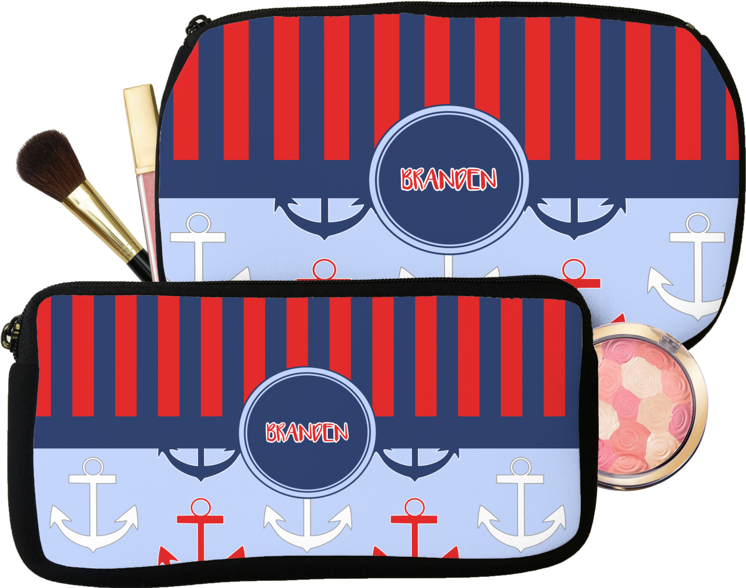 Our personalized makeup bags are available in many different designs, patterns and colors - so you are sure to find one that will love. They are made of neoprene (same material as wet-suits) and thus are water resistant, so spillages in your makeup bag will not end up all over you purse. They are customized on one side and are black on the other side and the zipper is black as well.