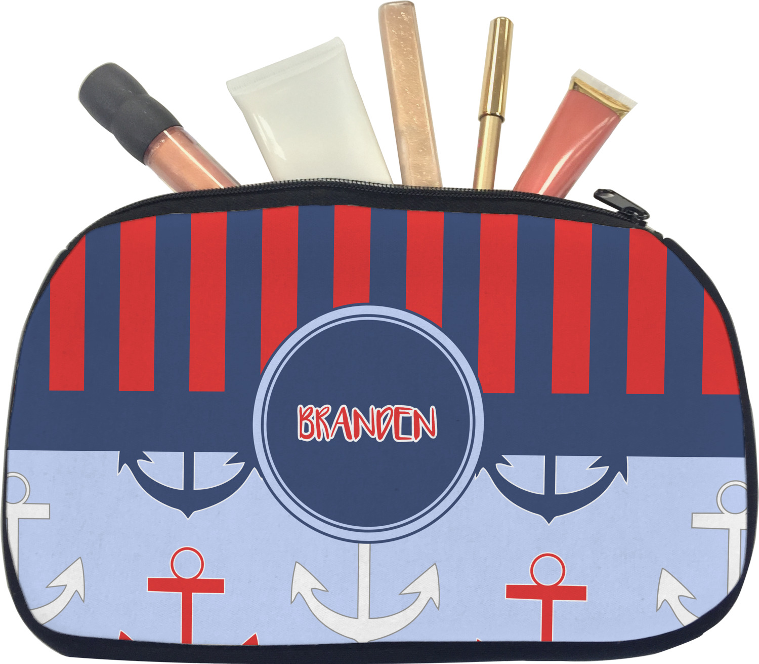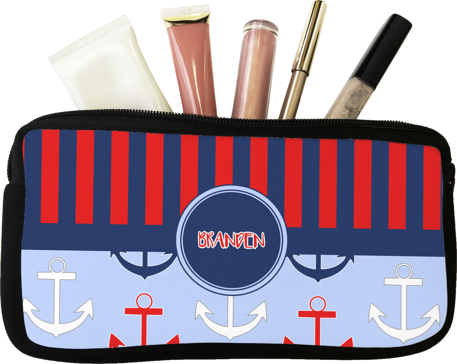 Our personalized makeup bags are available in many different designs, patterns and colors - so you are sure to find one that will love. They are made of neoprene (same material as wet-suits) and thus are water resistant, so spillages in your makeup bag will not end up all over you purse. They are customized on one side and are black on the other side and the zipper is black as well.