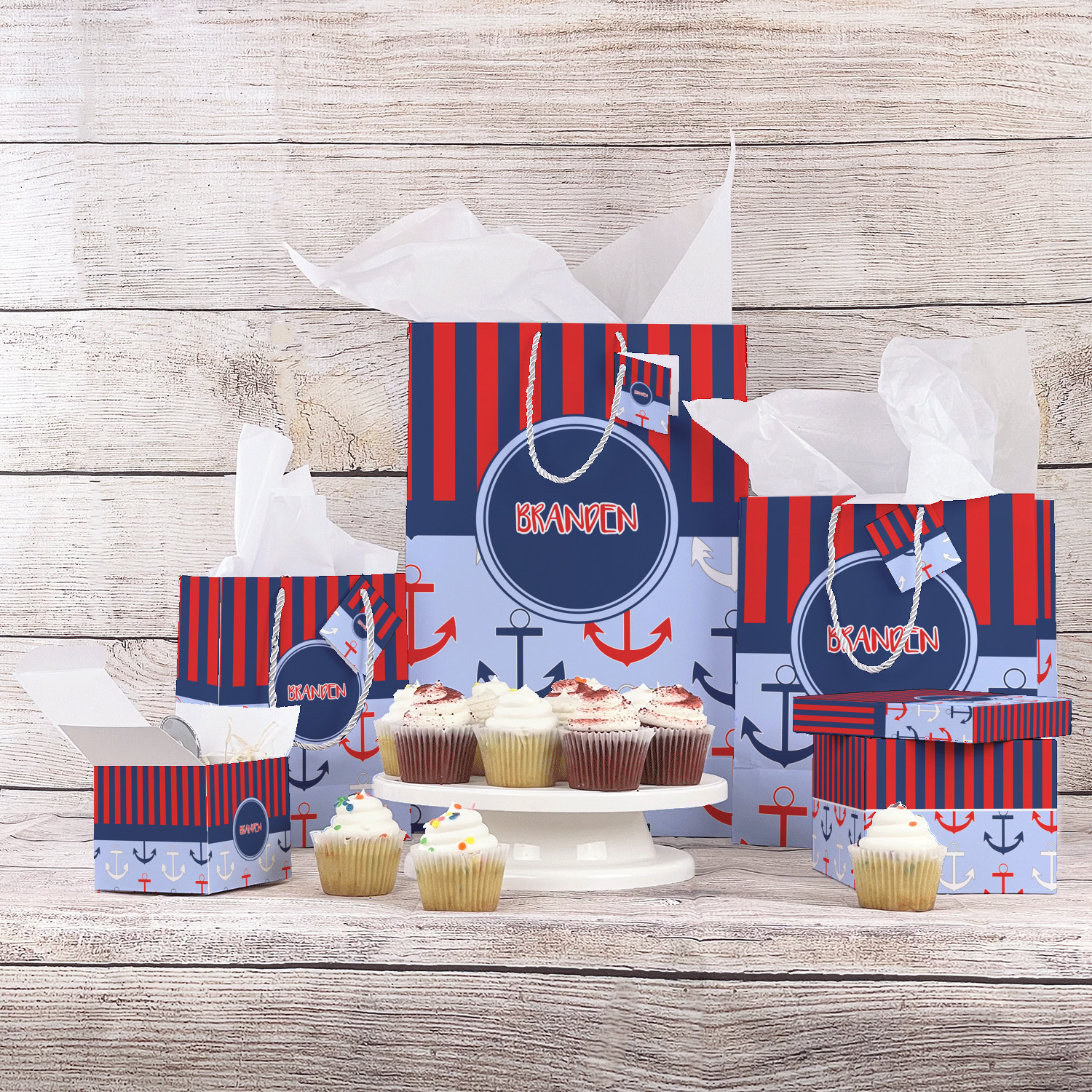 This anchor & stripes pattern is a classic nautical including the colors. We chose the classic nautical red and navy blue striped on top, with anchors in red, white and blue on the bottom. We chose a solid navy ribbon along with a circle label and personalized it with a name.