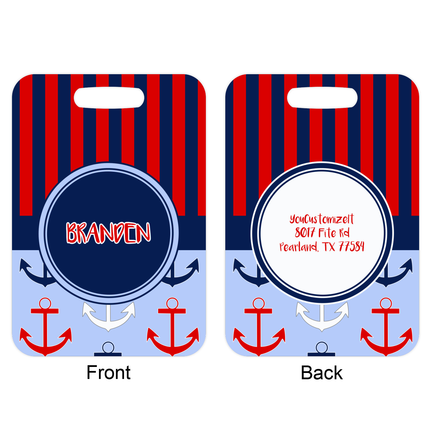 These metal luggage tags are printed on both sides; the front is printed with the design of your choice - and can be personalized with your name, name & initial or your monogram. The back can have as much or as little of your contact information as you desire - your name, your address, city, zip & state, you can also include your phone number and email address. Customize it exactly the way you want it!