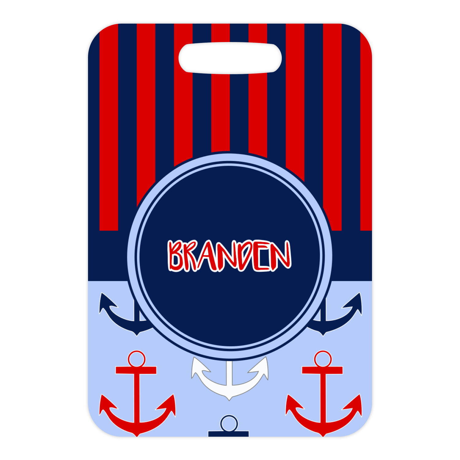 This anchor & stripes pattern is a classic nautical including the colors. We chose the classic nautical red and navy blue striped on top, with anchors in red, white and blue on the bottom. We chose a solid navy ribbon along with a circle label and personalized it with a name.