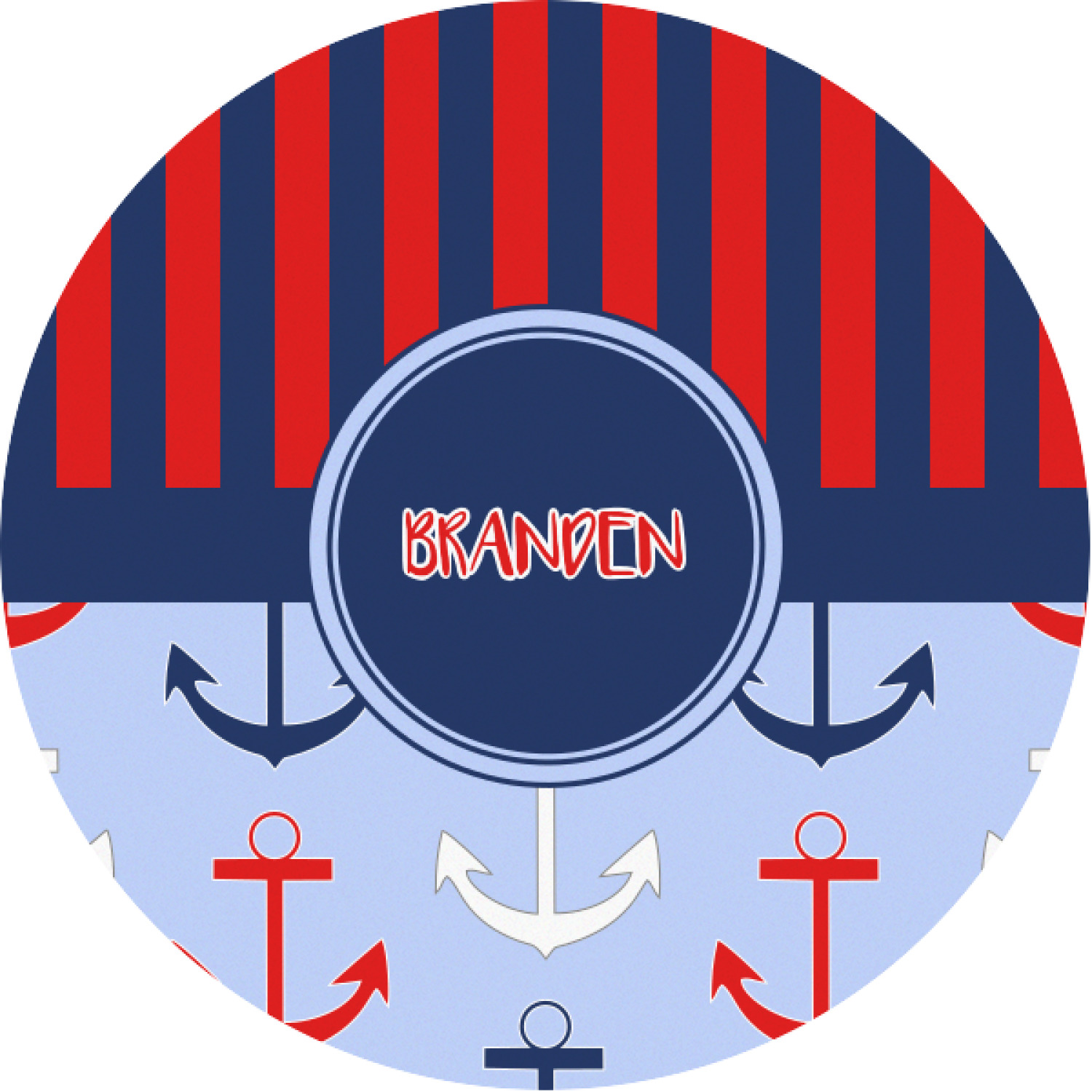 This anchor & stripes pattern is a classic nautical including the colors. We chose the classic nautical red and navy blue striped on top, with anchors in red, white and blue on the bottom. We chose a solid navy ribbon along with a circle label and personalized it with a name.