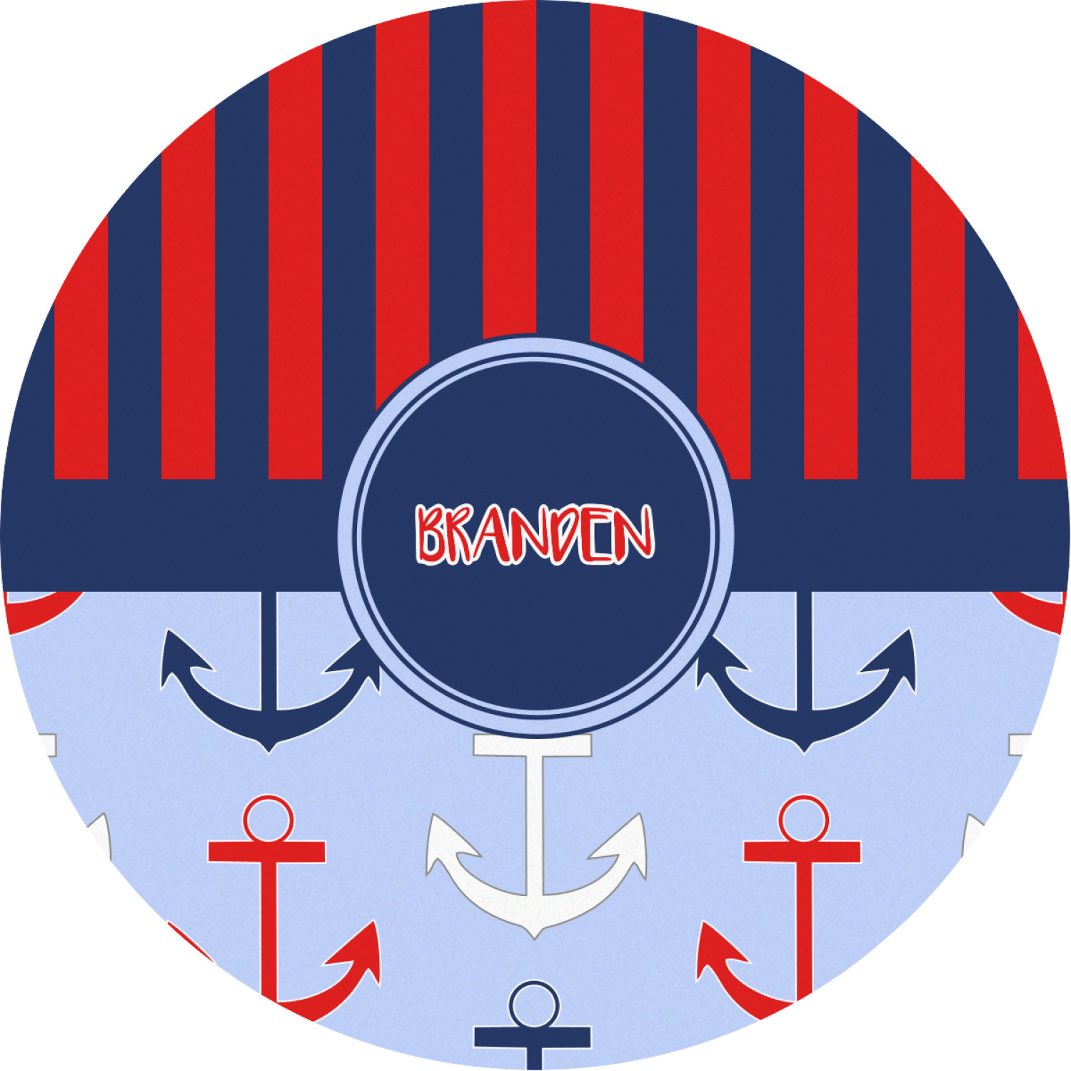 This anchor & stripes pattern is a classic nautical including the colors. We chose the classic nautical red and navy blue striped on top, with anchors in red, white and blue on the bottom. We chose a solid navy ribbon along with a circle label and personalized it with a name.