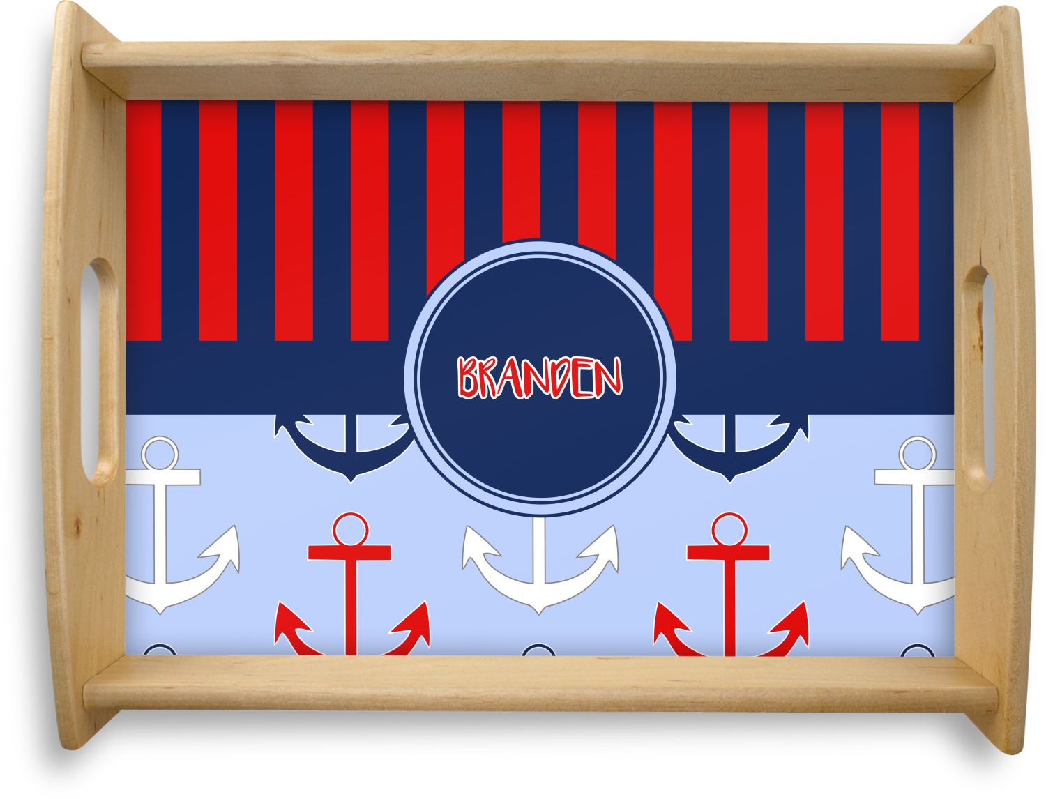 This serving tray with handles features square edges and two rounded sides, creating a very modern look. Each side is fabricated from a beautifully cut, natural wood. The bottom of the interior of the tray displays your customized design in bright, vibrant color. The tray is sold in both a black color and a natural wood look. Each variation of the wood serving tray has two sizes: Small, which is 14" x 10" x 2.25", and Large, which is 19.5" x 13.5" x 2.75".