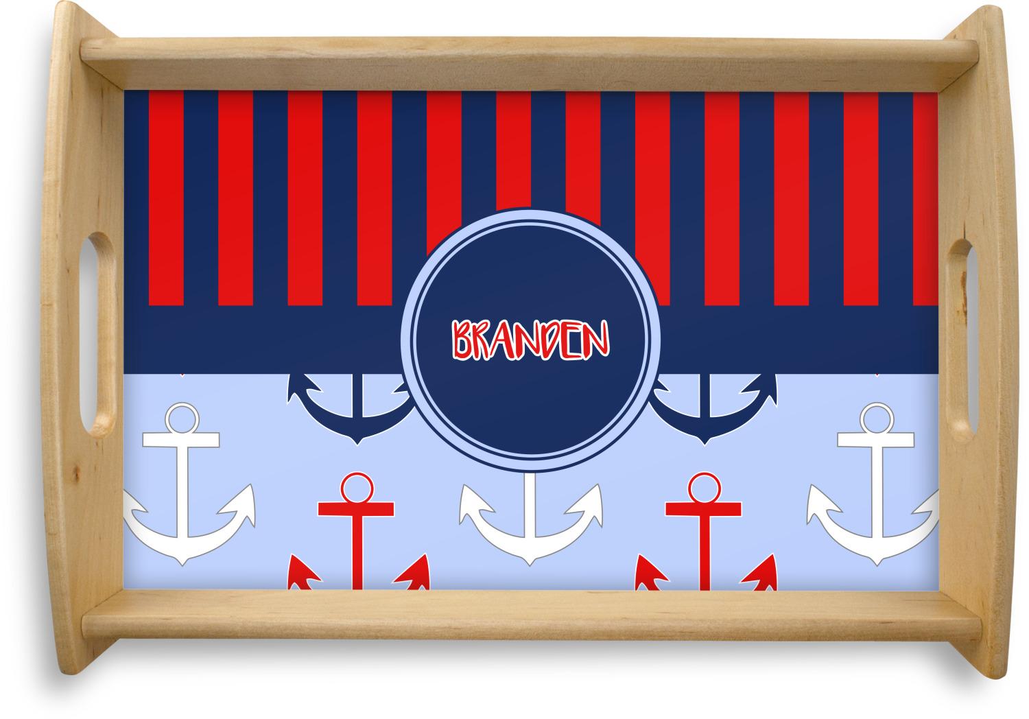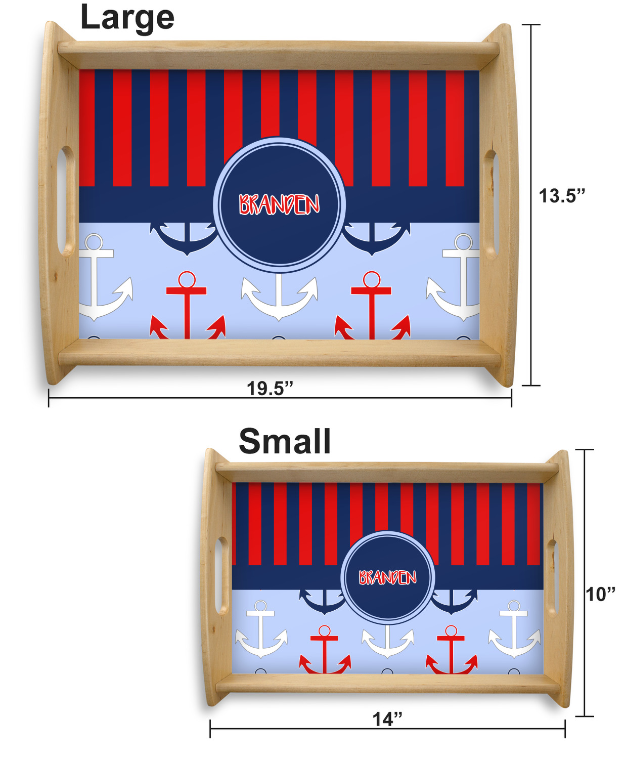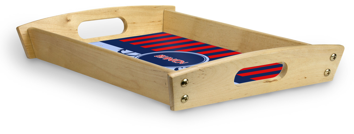 This serving tray with handles features square edges and two rounded sides, creating a very modern look. Each side is fabricated from a beautifully cut, natural wood. The bottom of the interior of the tray displays your customized design in bright, vibrant color. The tray is sold in both a black color and a natural wood look. Each variation of the wood serving tray has two sizes: Small, which is 14" x 10" x 2.25", and Large, which is 19.5" x 13.5" x 2.75".