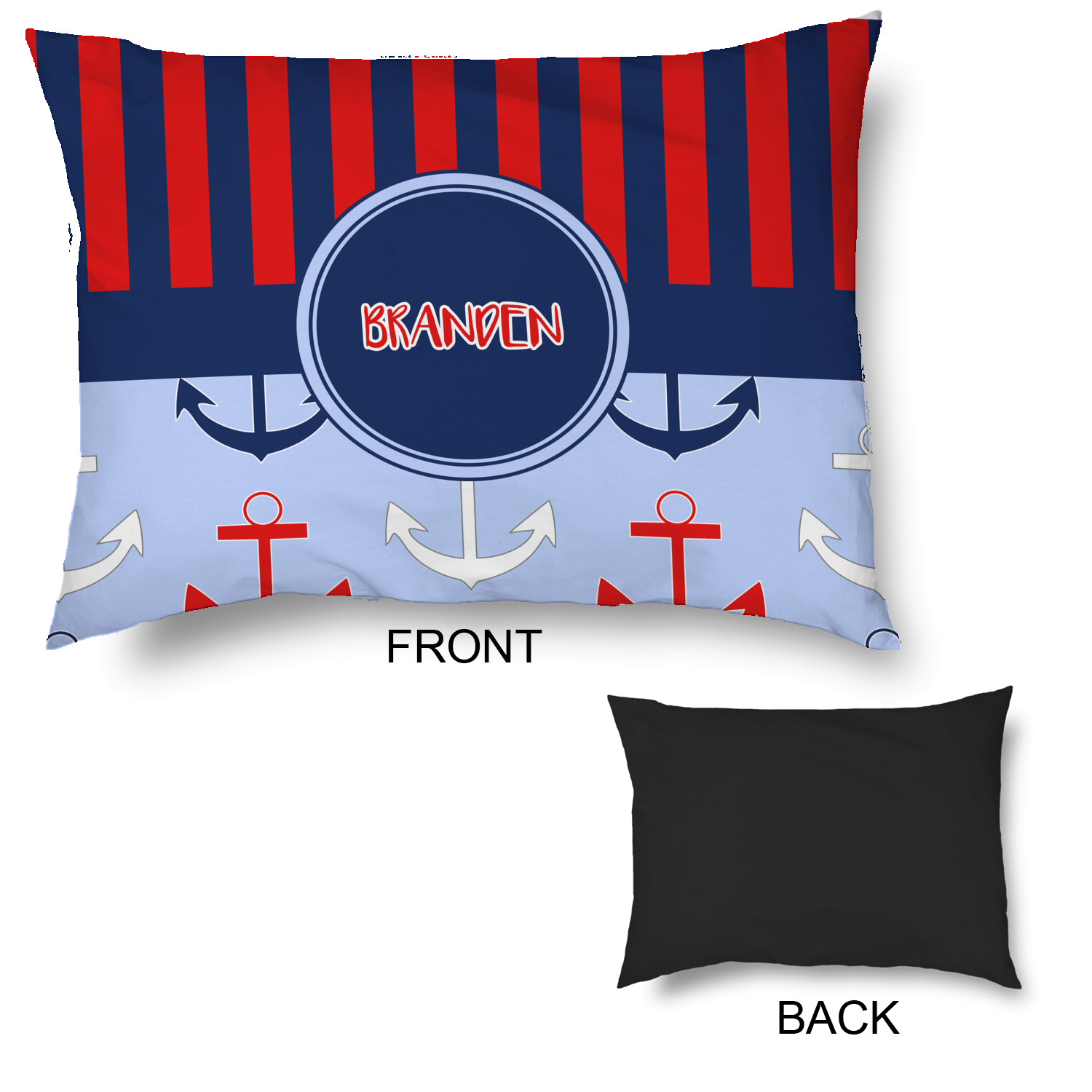 This anchor & stripes pattern is a classic nautical including the colors. We chose the classic nautical red and navy blue striped on top, with anchors in red, white and blue on the bottom. We chose a solid navy ribbon along with a circle label and personalized it with a name.