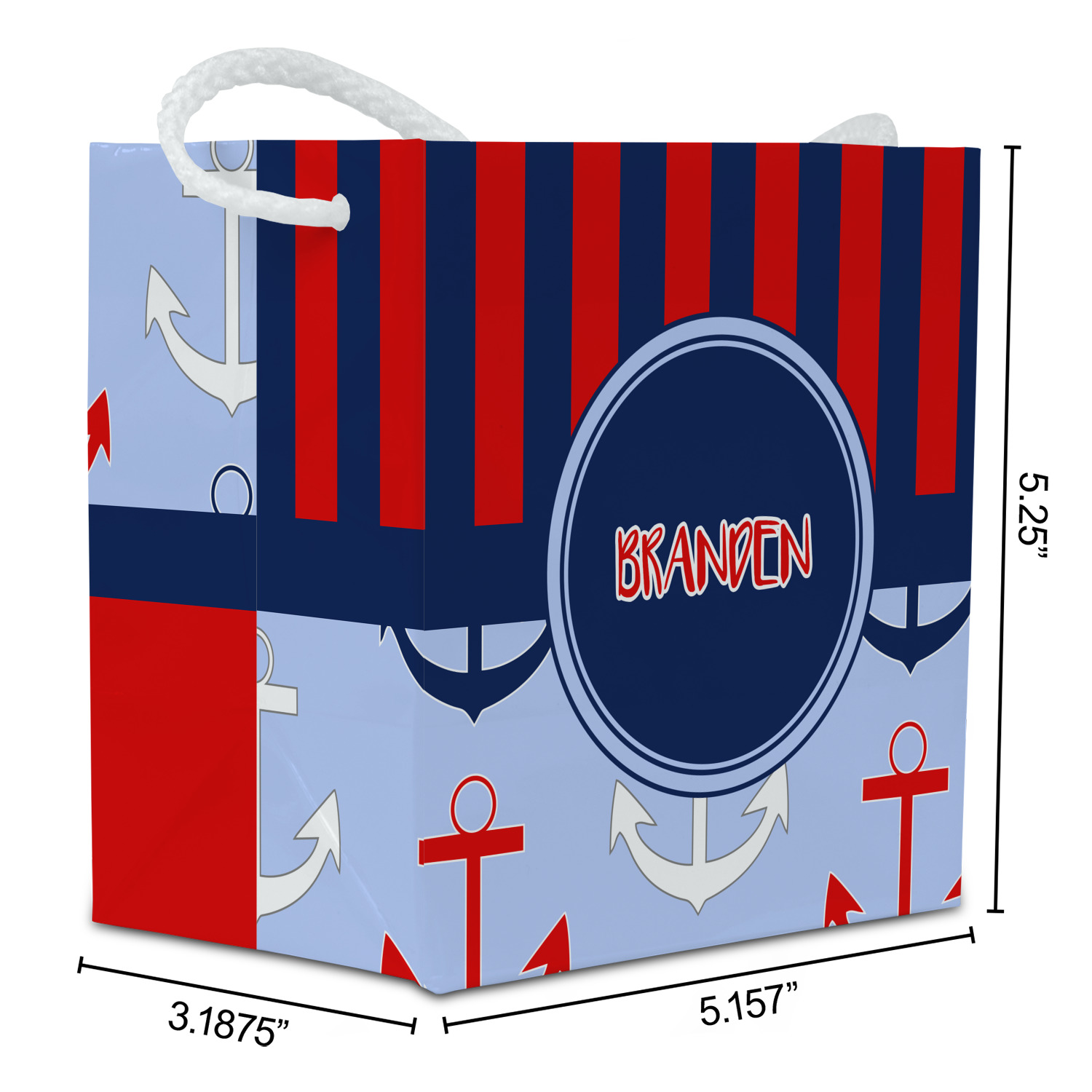 This anchor & stripes pattern is a classic nautical including the colors. We chose the classic nautical red and navy blue striped on top, with anchors in red, white and blue on the bottom. We chose a solid navy ribbon along with a circle label and personalized it with a name.