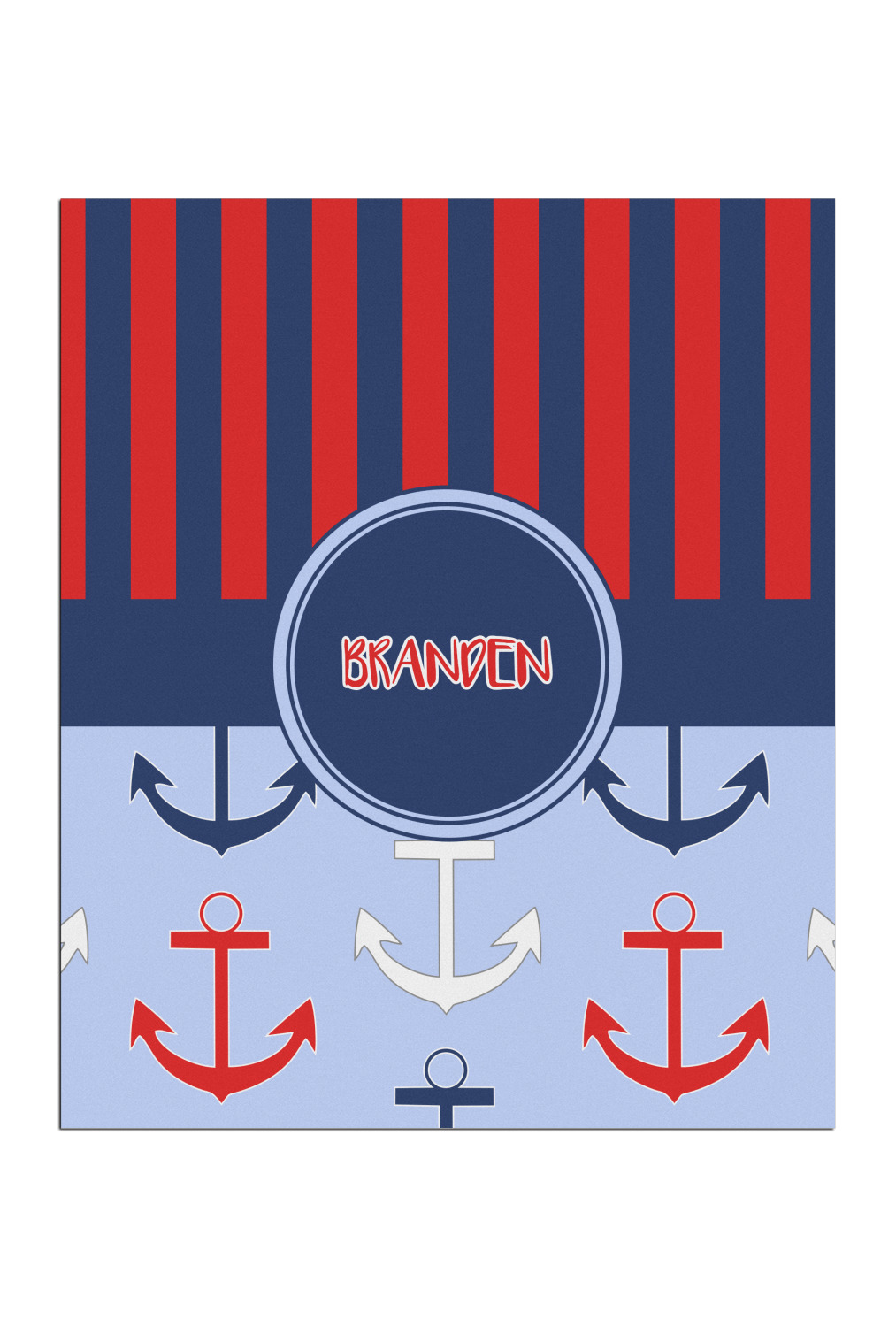 This anchor & stripes pattern is a classic nautical including the colors. We chose the classic nautical red and navy blue striped on top, with anchors in red, white and blue on the bottom. We chose a solid navy ribbon along with a circle label and personalized it with a name.
