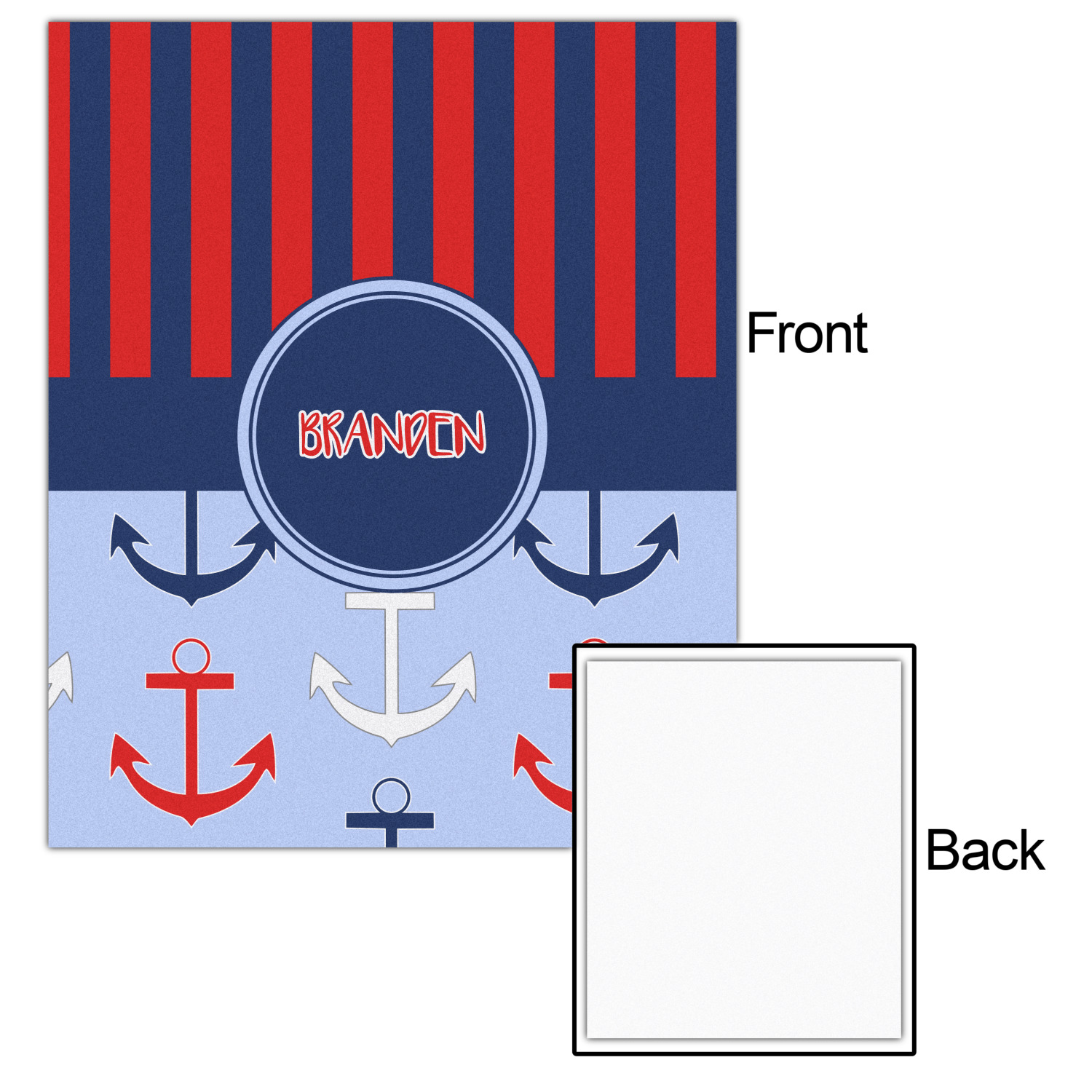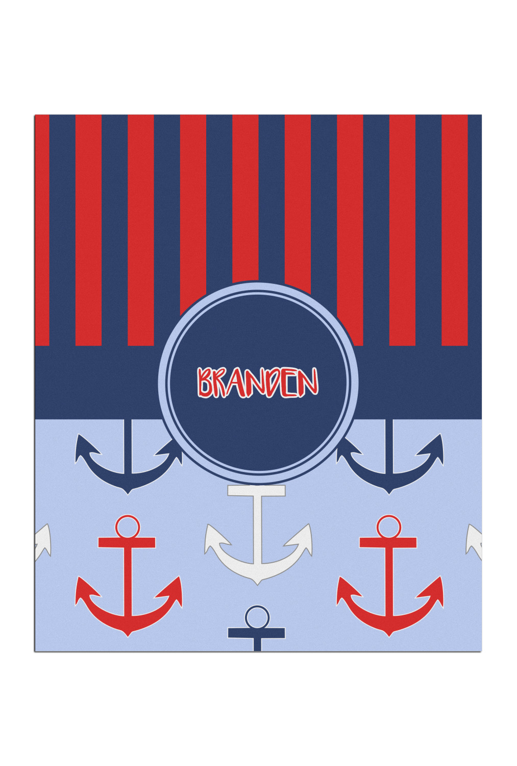 This anchor & stripes pattern is a classic nautical including the colors. We chose the classic nautical red and navy blue striped on top, with anchors in red, white and blue on the bottom. We chose a solid navy ribbon along with a circle label and personalized it with a name.