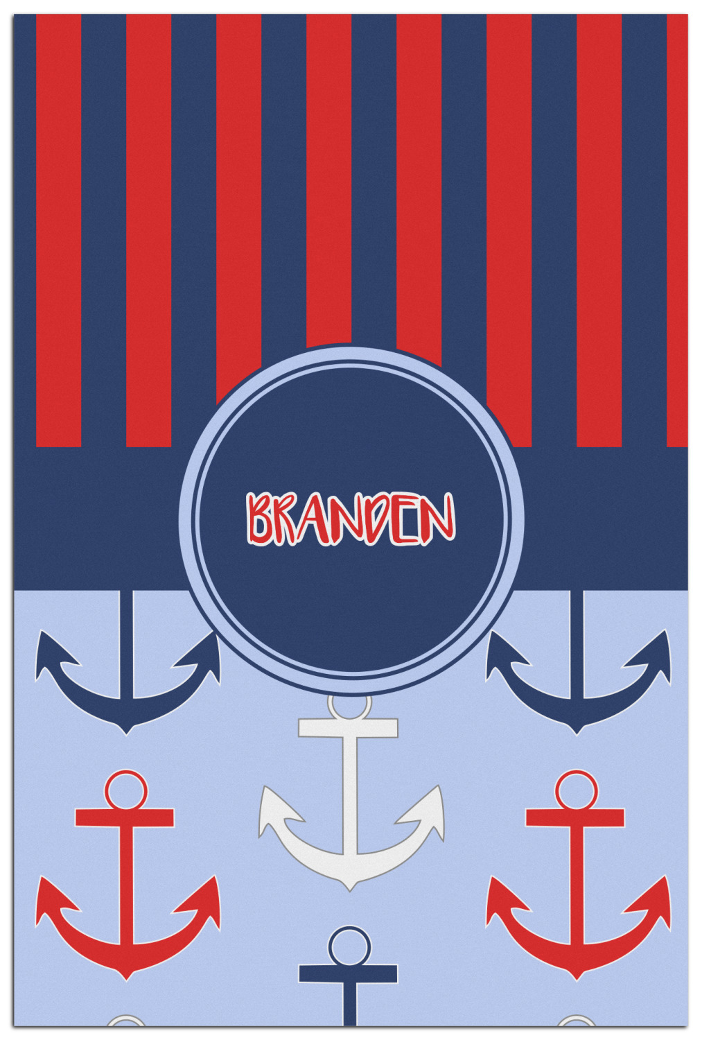 This anchor & stripes pattern is a classic nautical including the colors. We chose the classic nautical red and navy blue striped on top, with anchors in red, white and blue on the bottom. We chose a solid navy ribbon along with a circle label and personalized it with a name.