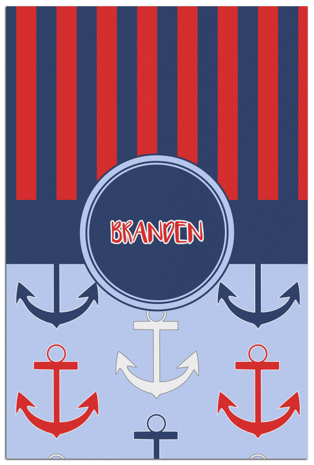 This anchor & stripes pattern is a classic nautical including the colors. We chose the classic nautical red and navy blue striped on top, with anchors in red, white and blue on the bottom. We chose a solid navy ribbon along with a circle label and personalized it with a name.