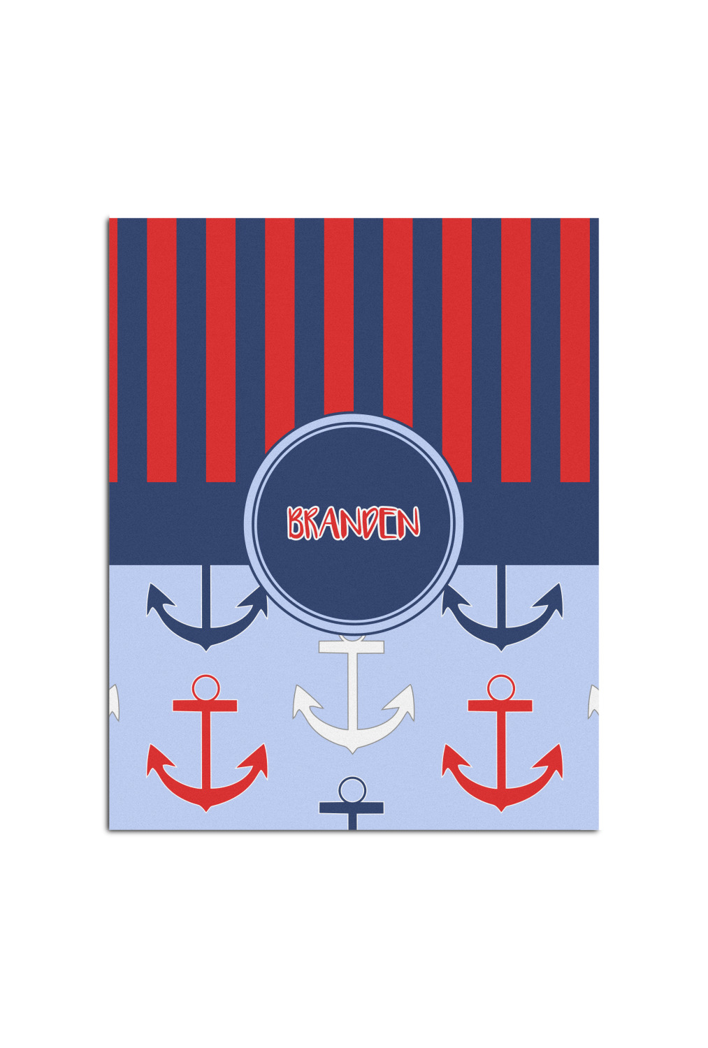 This anchor & stripes pattern is a classic nautical including the colors. We chose the classic nautical red and navy blue striped on top, with anchors in red, white and blue on the bottom. We chose a solid navy ribbon along with a circle label and personalized it with a name.