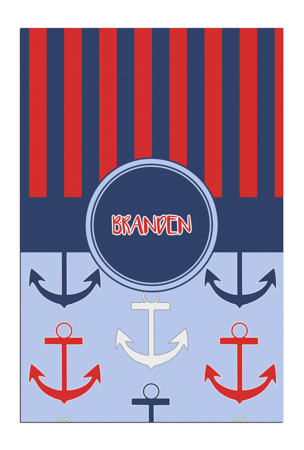 This anchor & stripes pattern is a classic nautical including the colors. We chose the classic nautical red and navy blue striped on top, with anchors in red, white and blue on the bottom. We chose a solid navy ribbon along with a circle label and personalized it with a name.