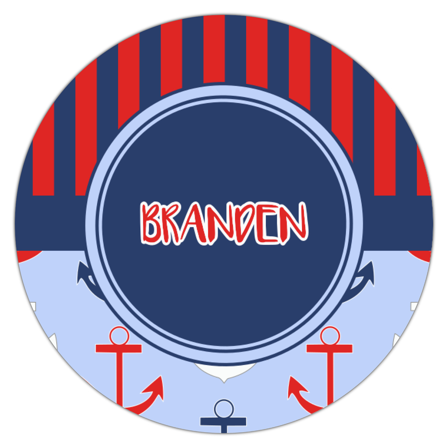 This anchor & stripes pattern is a classic nautical including the colors. We chose the classic nautical red and navy blue striped on top, with anchors in red, white and blue on the bottom. We chose a solid navy ribbon along with a circle label and personalized it with a name.