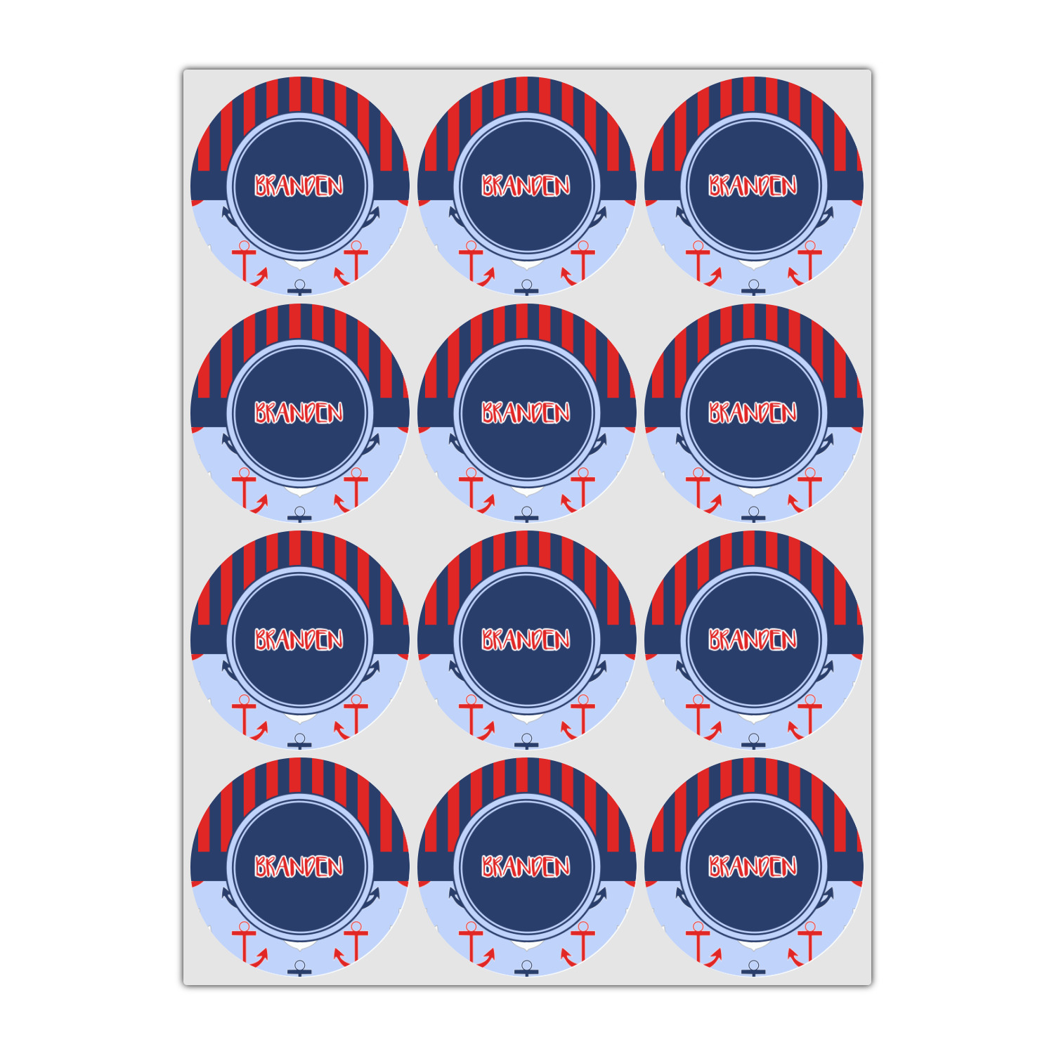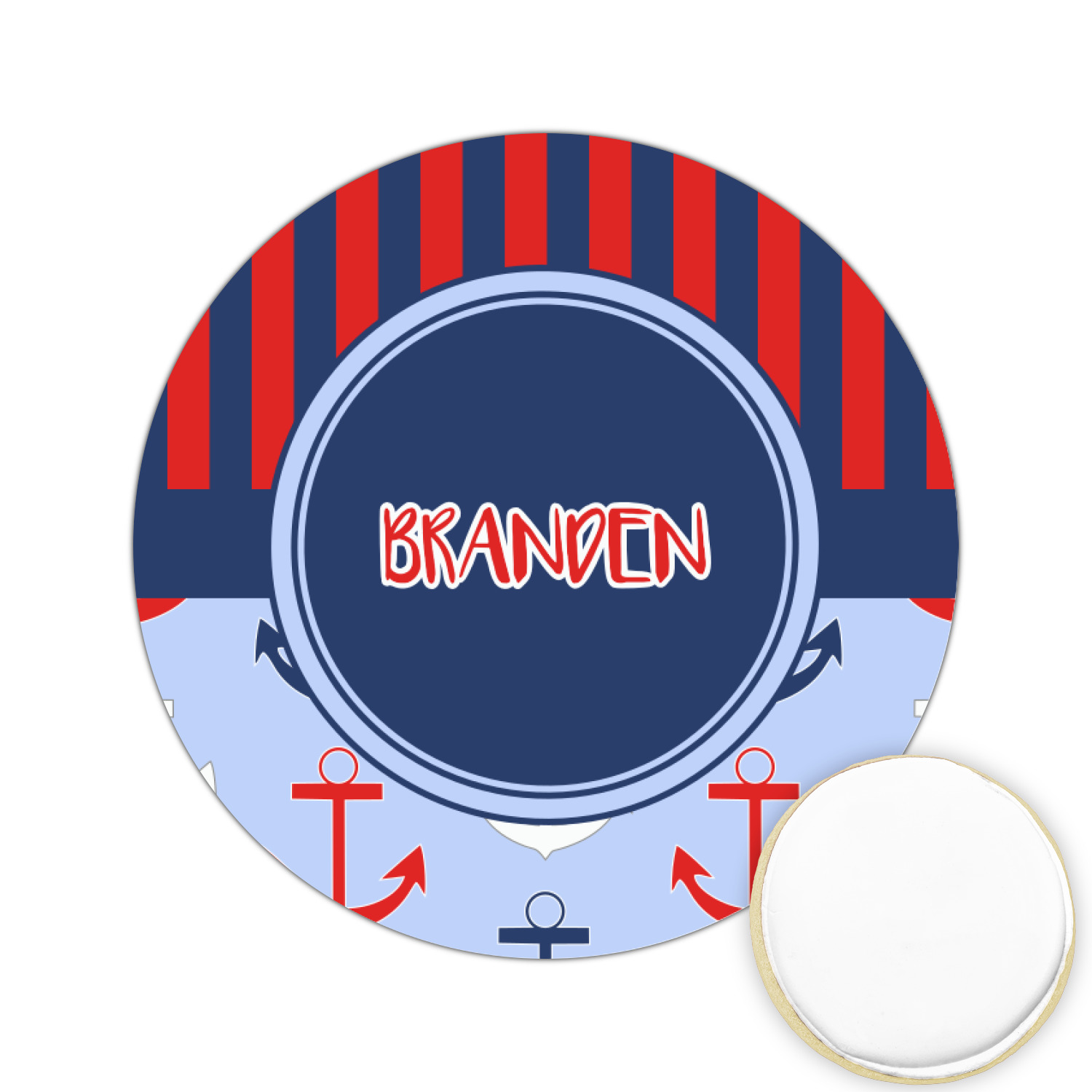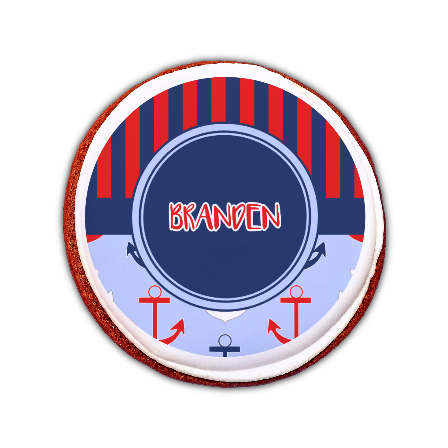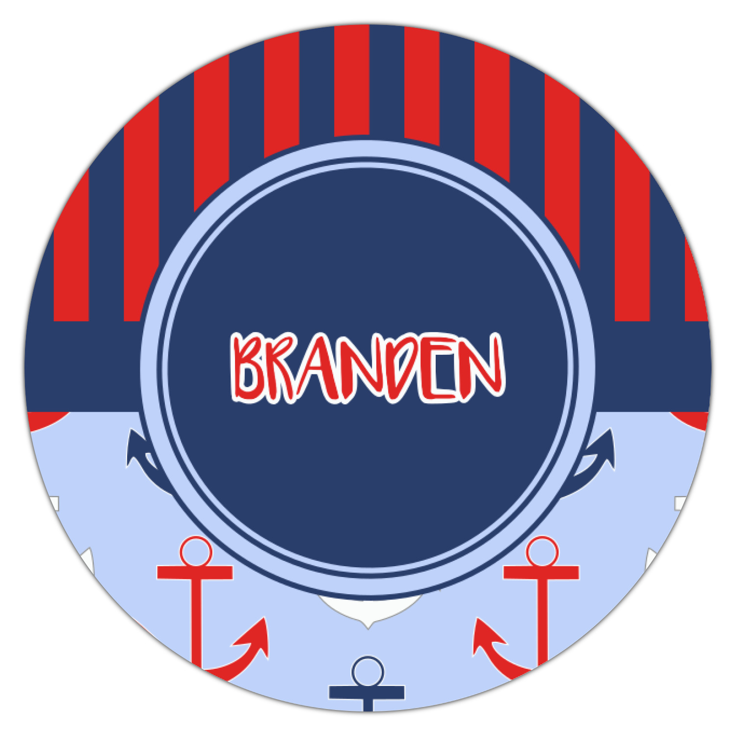 This anchor & stripes pattern is a classic nautical including the colors. We chose the classic nautical red and navy blue striped on top, with anchors in red, white and blue on the bottom. We chose a solid navy ribbon along with a circle label and personalized it with a name.