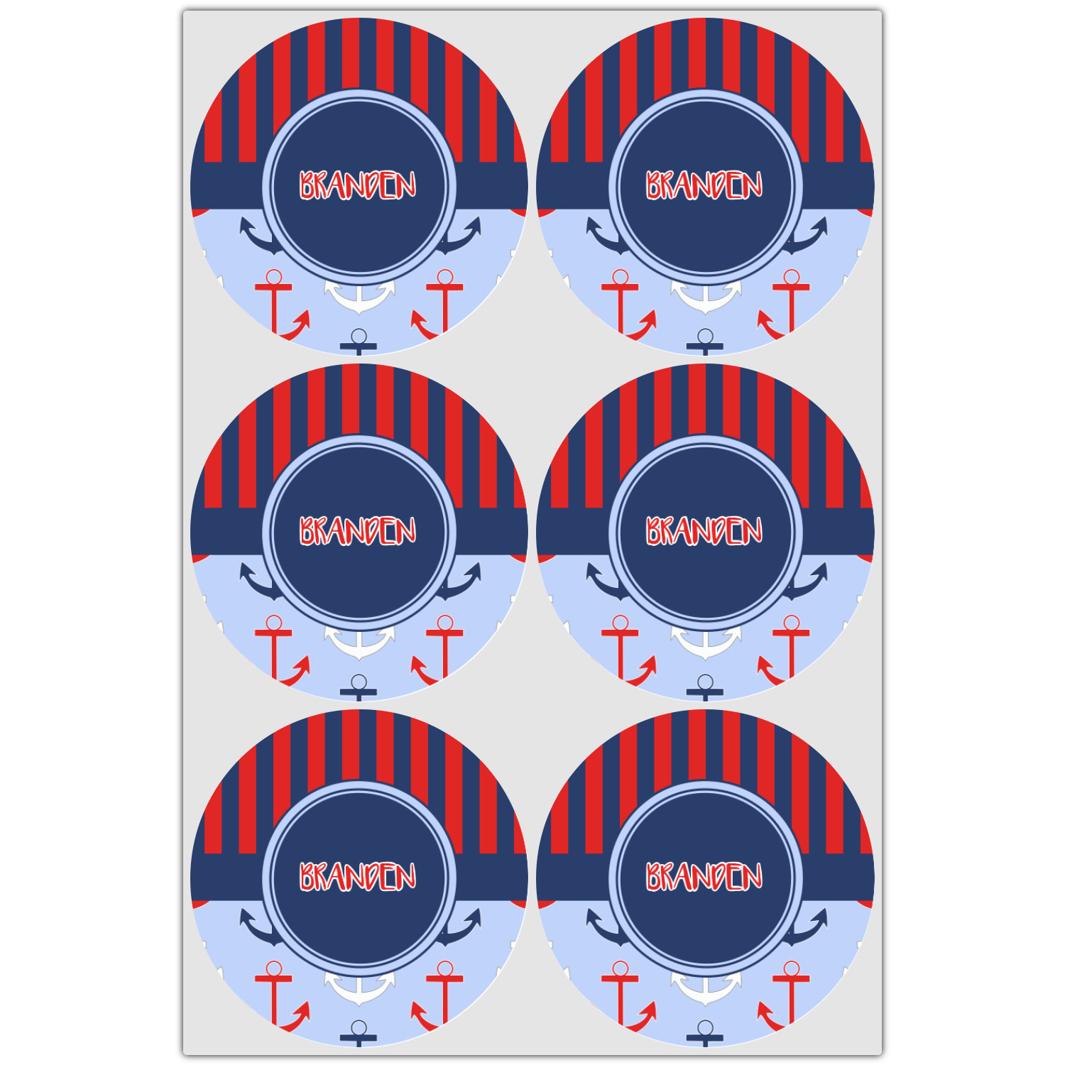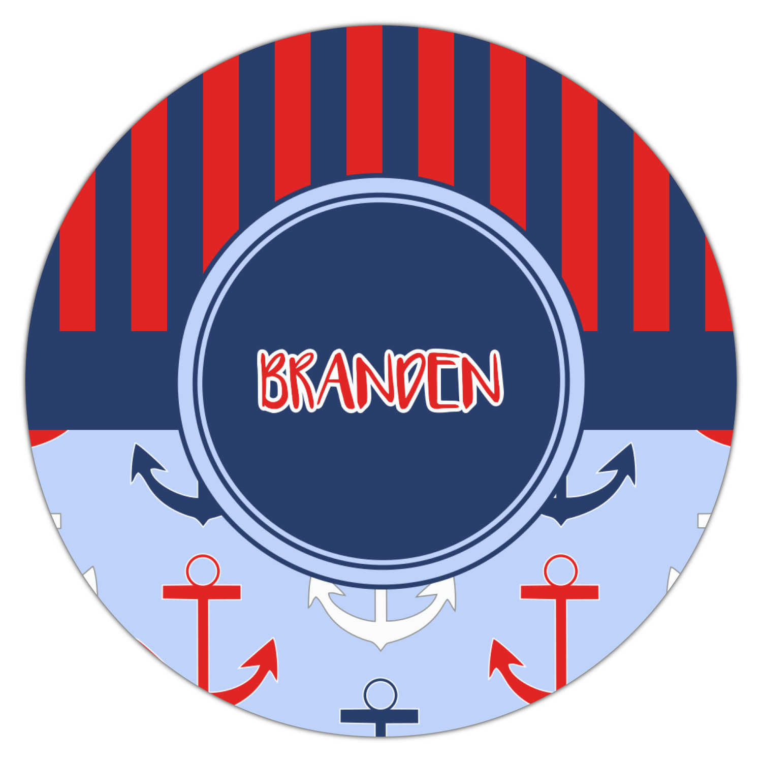 This anchor & stripes pattern is a classic nautical including the colors. We chose the classic nautical red and navy blue striped on top, with anchors in red, white and blue on the bottom. We chose a solid navy ribbon along with a circle label and personalized it with a name.