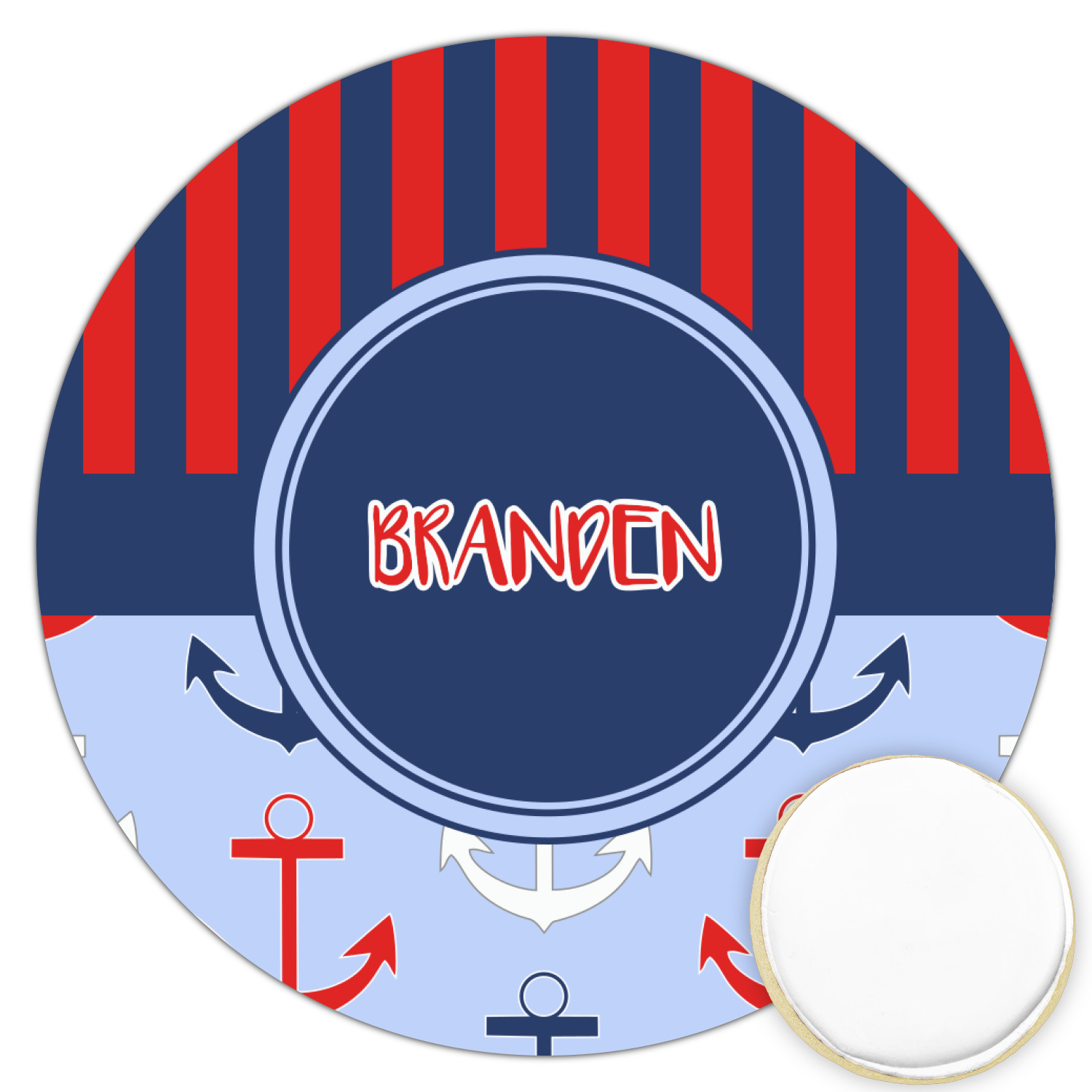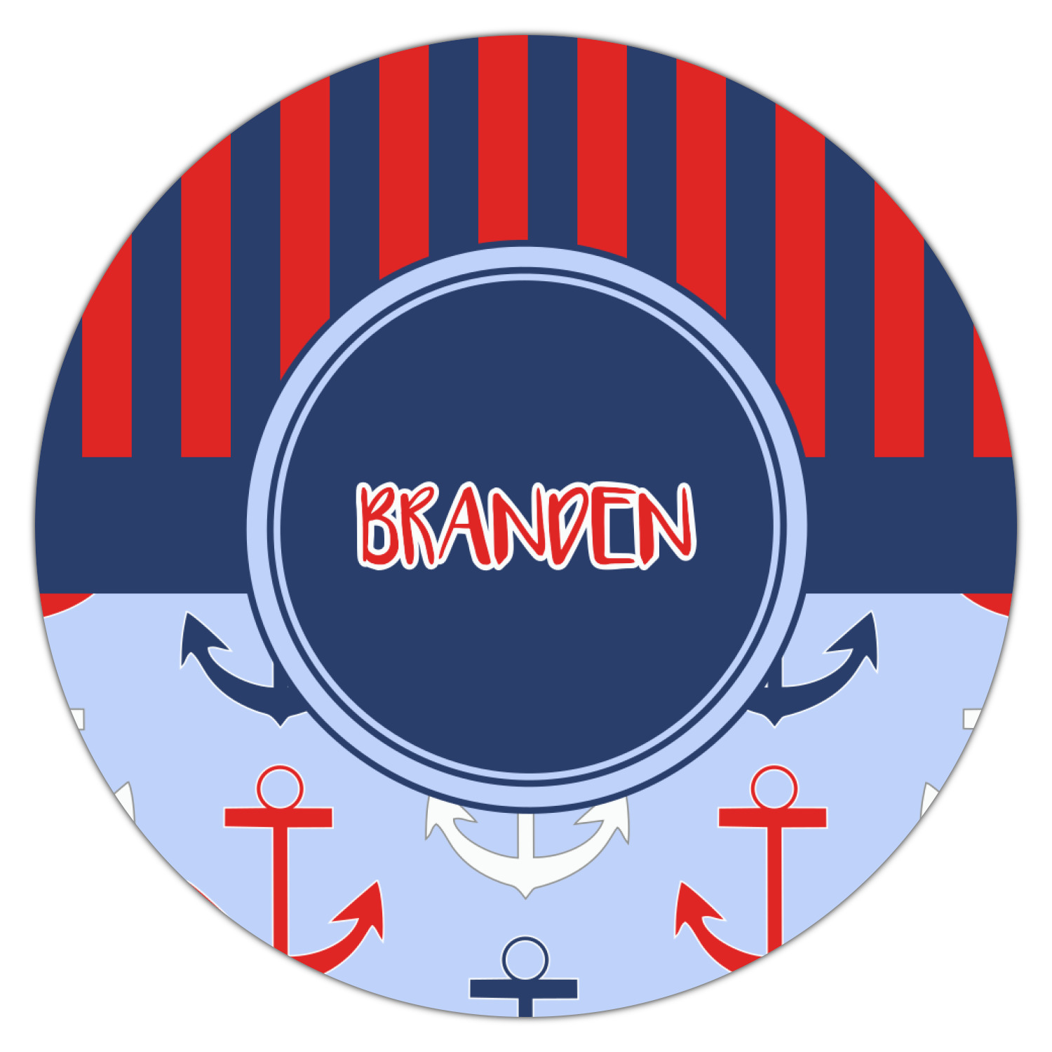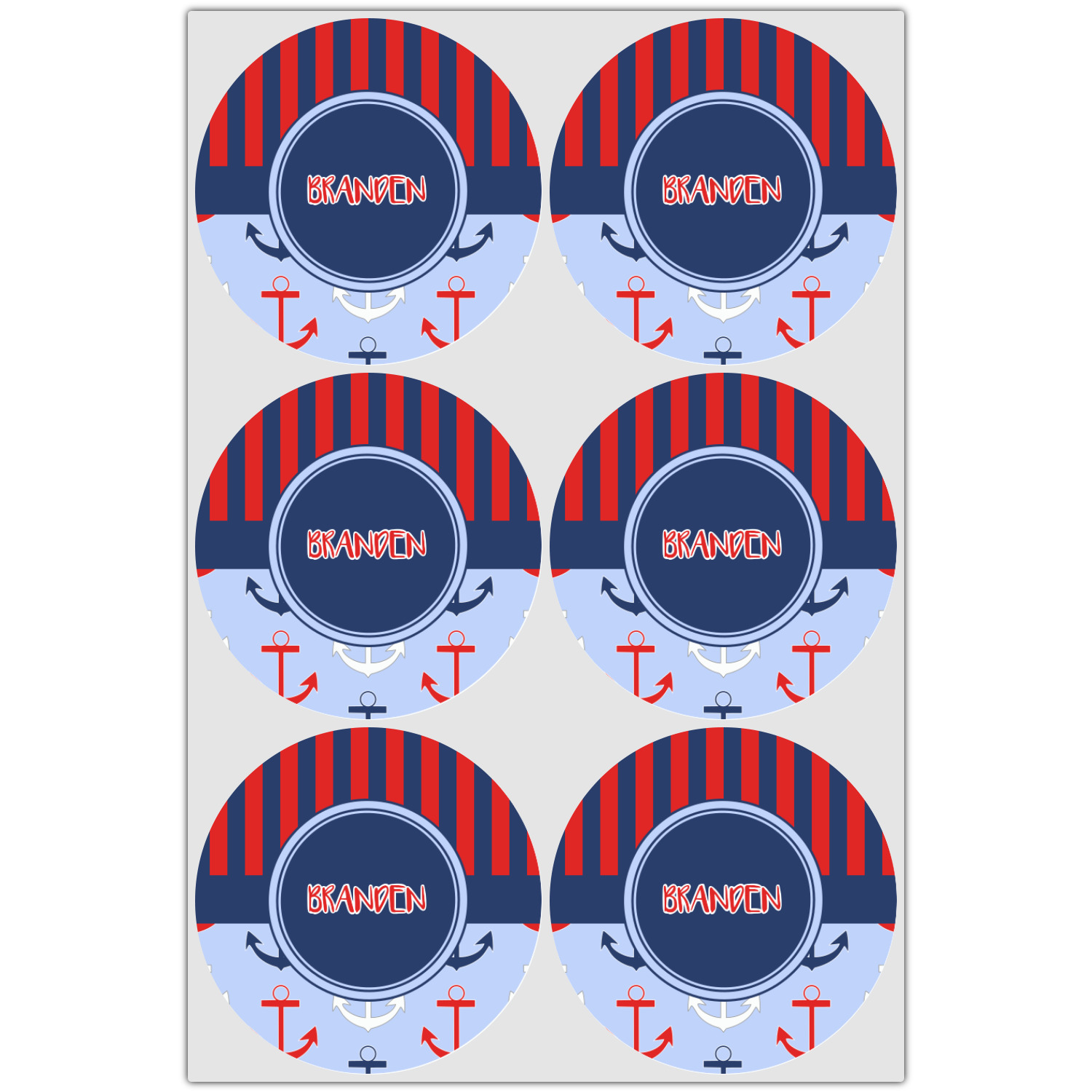 This anchor & stripes pattern is a classic nautical including the colors. We chose the classic nautical red and navy blue striped on top, with anchors in red, white and blue on the bottom. We chose a solid navy ribbon along with a circle label and personalized it with a name.