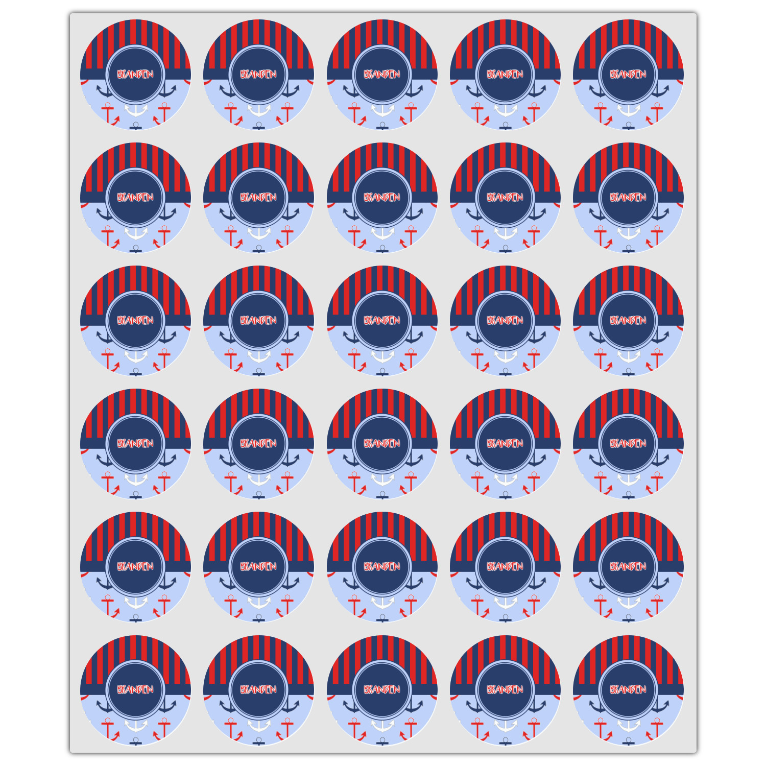 This anchor & stripes pattern is a classic nautical including the colors. We chose the classic nautical red and navy blue striped on top, with anchors in red, white and blue on the bottom. We chose a solid navy ribbon along with a circle label and personalized it with a name.