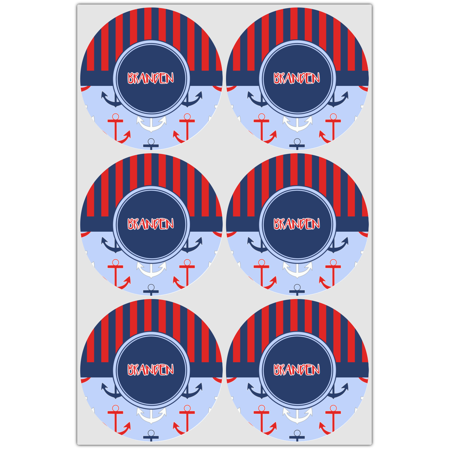 This anchor & stripes pattern is a classic nautical including the colors. We chose the classic nautical red and navy blue striped on top, with anchors in red, white and blue on the bottom. We chose a solid navy ribbon along with a circle label and personalized it with a name.