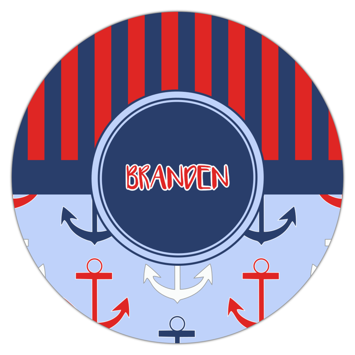 This anchor & stripes pattern is a classic nautical including the colors. We chose the classic nautical red and navy blue striped on top, with anchors in red, white and blue on the bottom. We chose a solid navy ribbon along with a circle label and personalized it with a name.