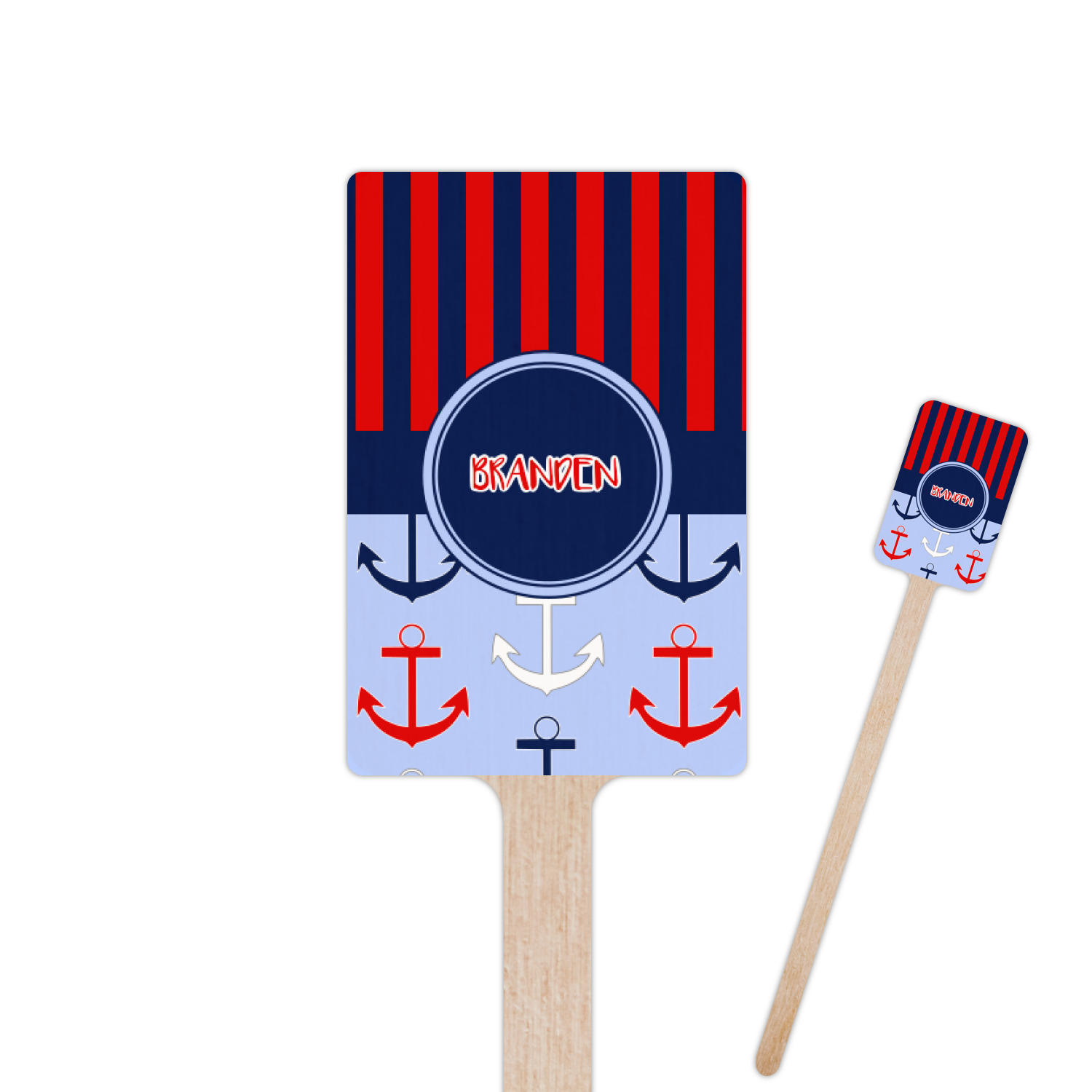 This anchor & stripes pattern is a classic nautical including the colors. We chose the classic nautical red and navy blue striped on top, with anchors in red, white and blue on the bottom. We chose a solid navy ribbon along with a circle label and personalized it with a name.