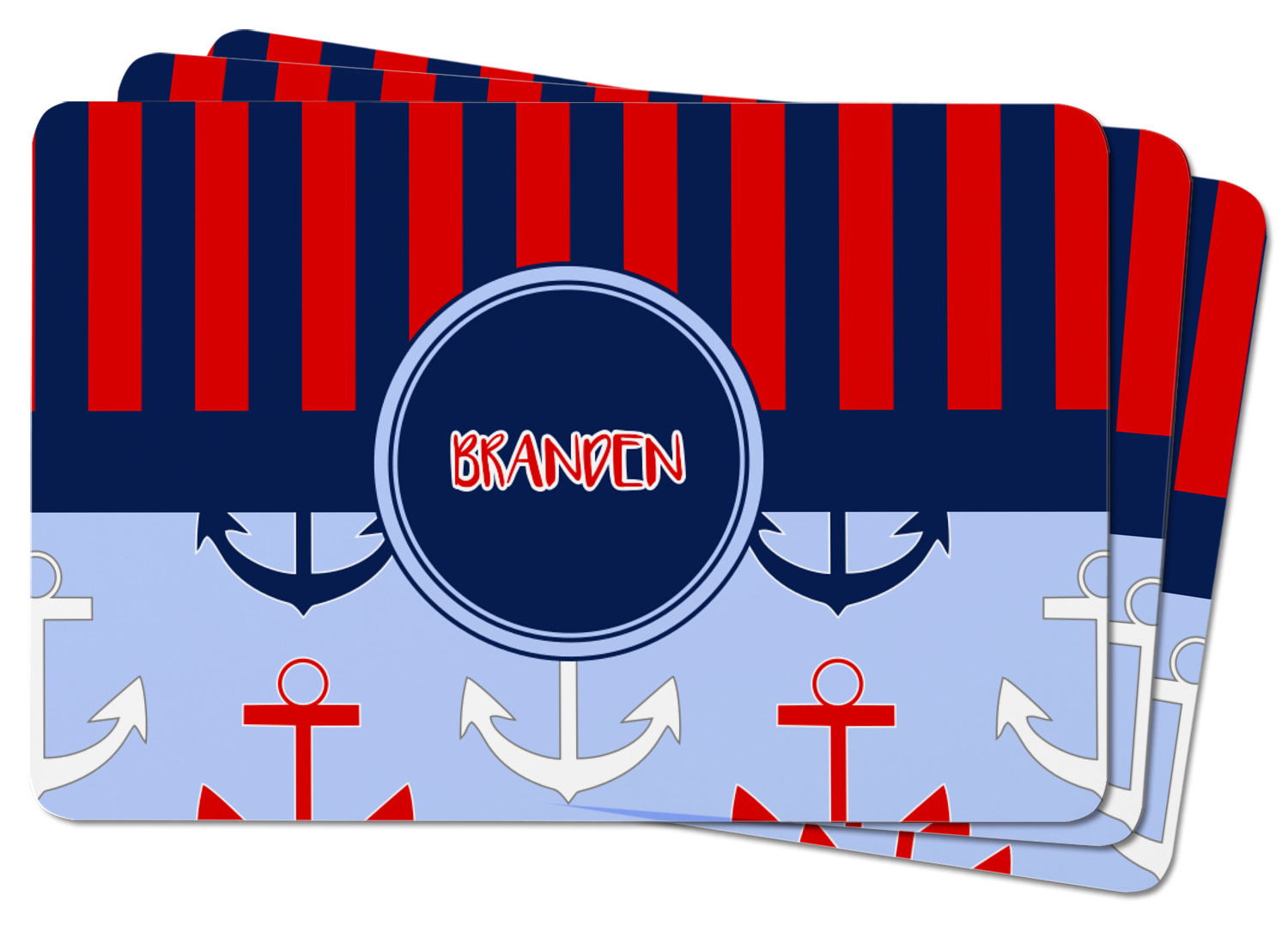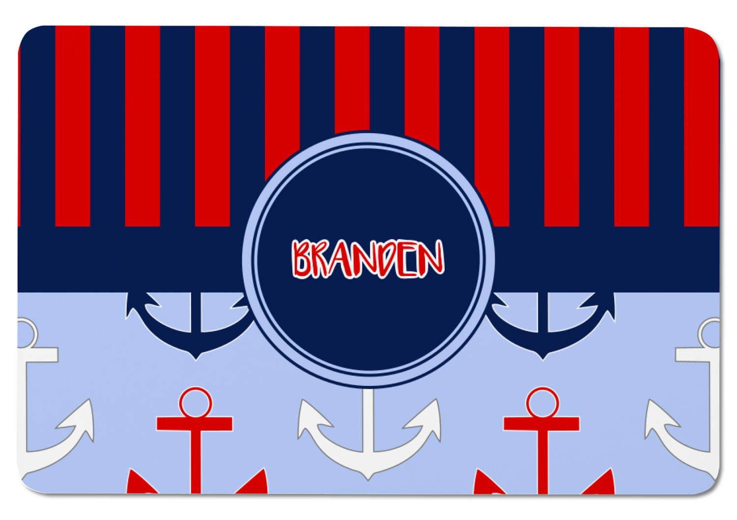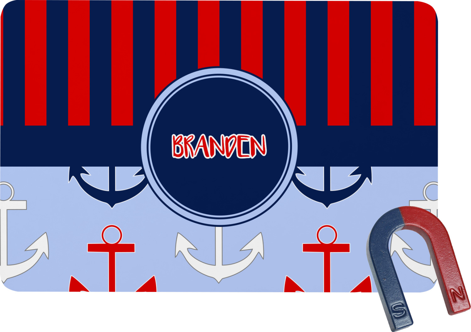 This anchor & stripes pattern is a classic nautical including the colors. We chose the classic nautical red and navy blue striped on top, with anchors in red, white and blue on the bottom. We chose a solid navy ribbon along with a circle label and personalized it with a name.