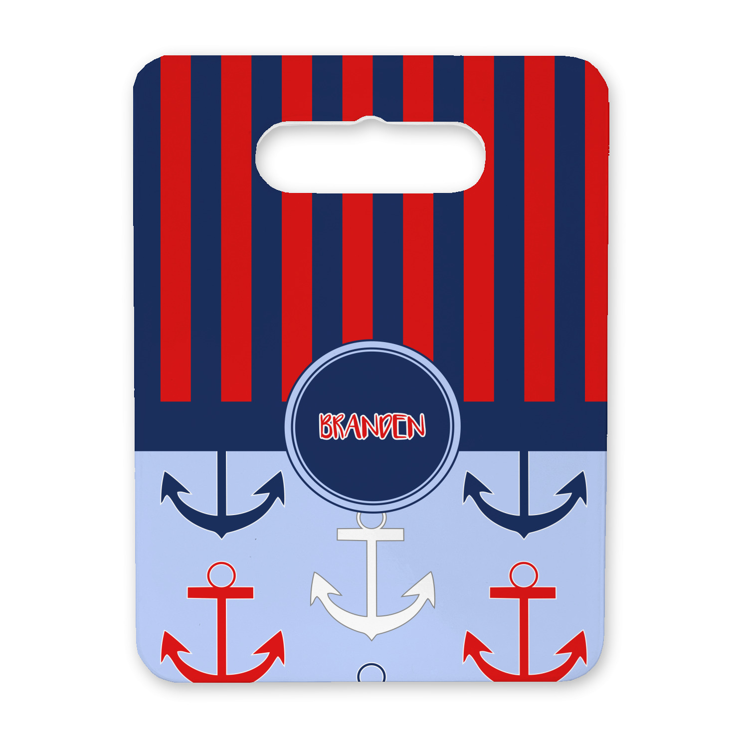 This anchor & stripes pattern is a classic nautical including the colors. We chose the classic nautical red and navy blue striped on top, with anchors in red, white and blue on the bottom. We chose a solid navy ribbon along with a circle label and personalized it with a name.