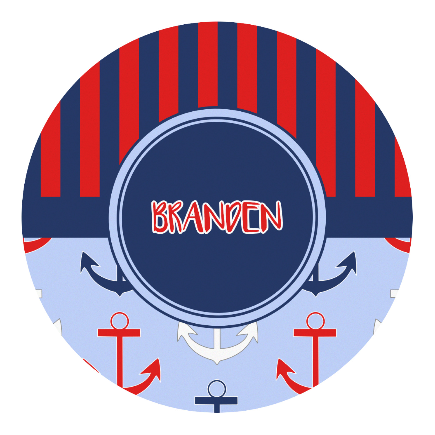 This anchor & stripes pattern is a classic nautical including the colors. We chose the classic nautical red and navy blue striped on top, with anchors in red, white and blue on the bottom. We chose a solid navy ribbon along with a circle label and personalized it with a name.