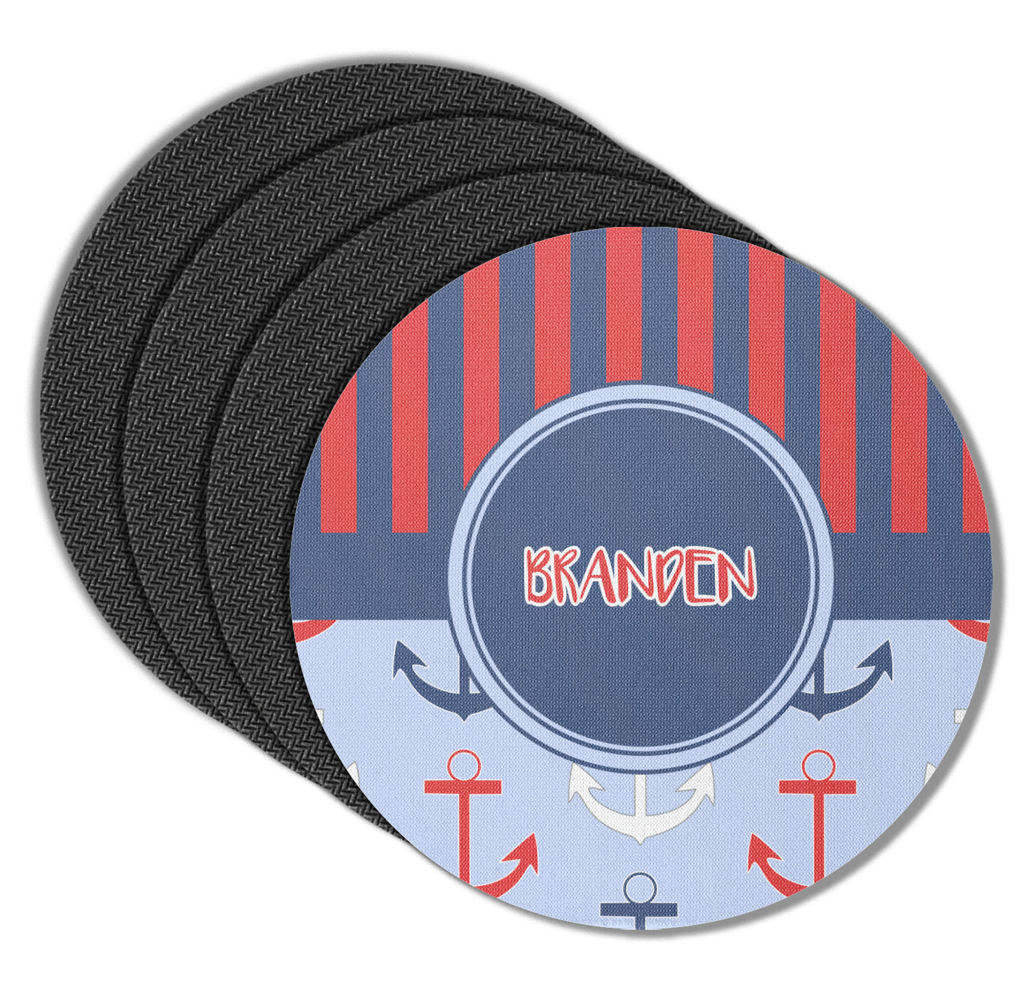 These drink coasters have a smooth, polyester top and a textured, rubber backing on its bottom. The non-slip rubber backing underneath works to keep any spills at bay. At 4 by 4 by 0.25 inches thick, these custom coasters are a suitable size for most drinkware. Your personalization is displayed atop the face of the cup coaster. We sell these rubber coasters in two different shapes: square and round. You can buy each shape as singulars or as a set of 4.