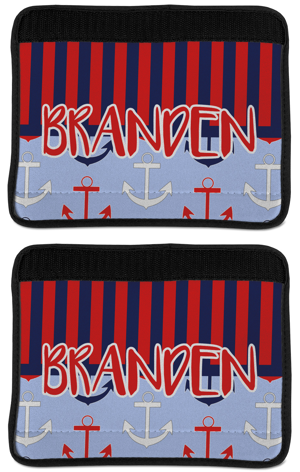 Made from neoprene, our seat belt strap covers wrap around the belt itself and have a Velcro tab for easy attachment and closure. The belt's edges are trimmed with a black polyester for a secure finish. Each cover is 9.5 by 7 inches when open and 9.5 by 2.5 inches when closed. We print your personalized design on the face of the seat belt pad.